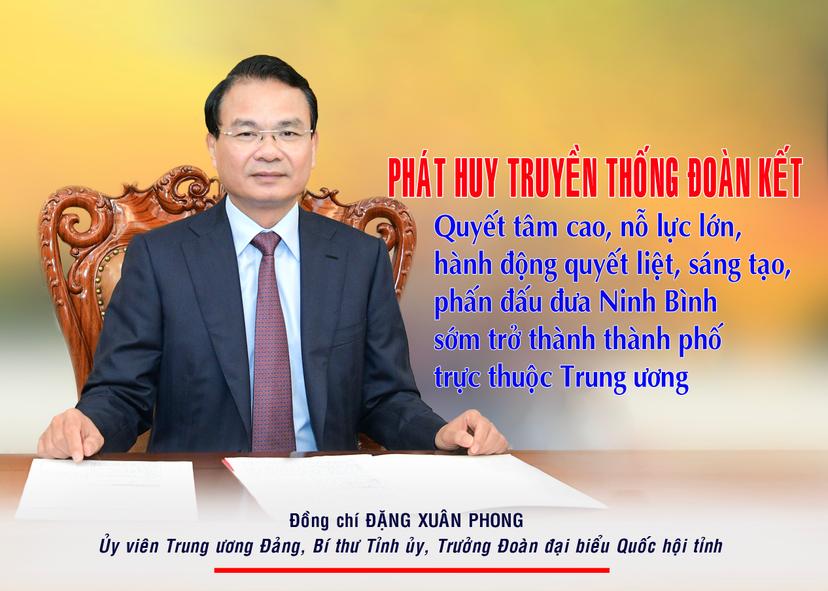Năm là, phát huy mạnh mẽ sức mạnh mềm về văn hóa, con người và giá trị thương hiệu của Ninh Bình. Tiếp tục bảo tồn và phát huy giá trị di sản văn hóa, sinh thái; phát triển du lịch chất lượng cao gắn với công nghiệp văn hóa và kinh tế di sản, đưa du lịch trở thành ngành kinh tế mũi nhọn. Thực hiện tốt các chính sách an sinh xã hội; nâng cao chất lượng y tế, giáo dục; chăm lo đời sống Nhân dân. Củng cố quốc phòng, an ninh; xây dựng thế trận quốc phòng toàn dân gắn với thế trận an ninh nhân dân vững chắc; giữ vững ổn định chính trị, trật tự an toàn xã hội, tạo môi trường thuận lợi cho phát triển nhanh và bền vững. Phát huy truyền thống quê hương văn hiến, anh hùng, với khát vọng vươn lên mạnh mẽ, Đảng bộ, chính quyền, quân và Nhân dân Ninh Bình tiếp tục nêu cao tinh thần đoàn kết, thống nhất; quyết tâm cao, nỗ lực lớn, hành động quyết liệt, sáng tạo, hiệu quả; phấn đấu đến năm 2030 đưa Ninh Bình trở thành tỉnh khá, cực tăng trưởng phía Nam Đồng bằng Sông Hồng, sớm trở thành thành phố trực thuộc Trung ương; là trung tâm lớn về du lịch, công nghiệp văn hóa, kinh tế di sản của cả nước và khu vực Đông Nam Á; xứng đáng với niềm tin, kỳ vọng của Đảng, Nhà nước và Nhân dân trong giai đoạn phát triển mới. |