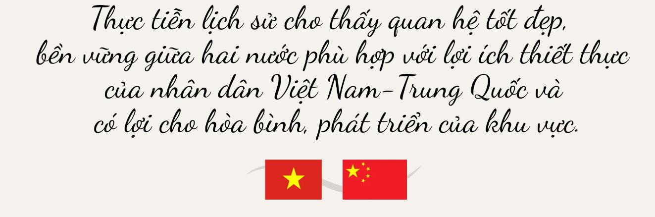 Việt Nam và Trung Quốc là hai nước láng giềng "núi liền núi, sông liền sông", có nhiều nét tương đồng về văn hóa. Quan hệ giữa hai dân tộc được bồi đắp qua giao lưu lâu dài trong lịch sử và được thử thách, tôi luyện qua thời gian. Trong quan hệ giữa các quốc gia láng giềng, điều có ý nghĩa bền vững nhất là biết nhìn nhận quan hệ từ tầm cao chiến lược với tầm nhìn lâu dài; biết trân trọng những giá trị đã được các thế hệ đi trước dày công vun đắp; biết đặt lợi ích căn bản, lâu dài của nhân dân lên trên hết, trước hết. Đó cũng là cách Việt Nam nhìn nhận và phát triển quan hệ với Trung Quốc.