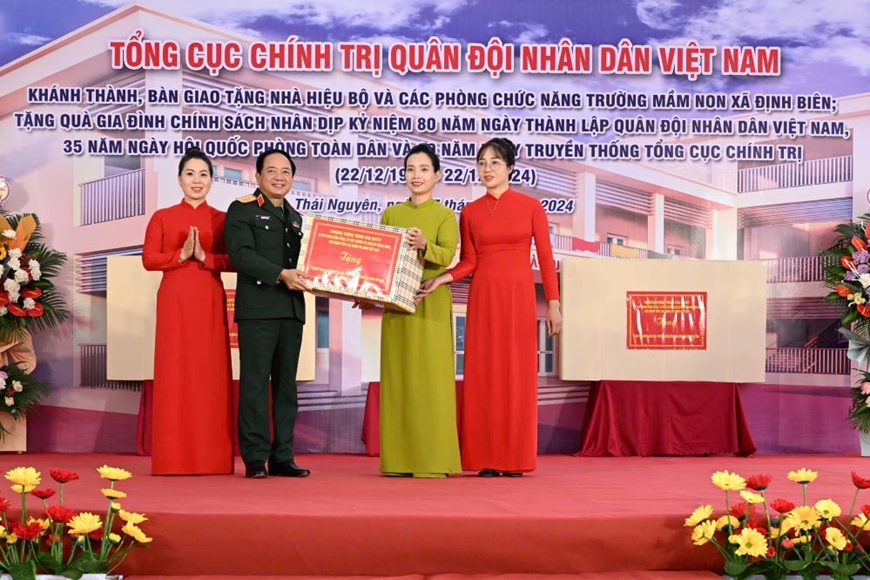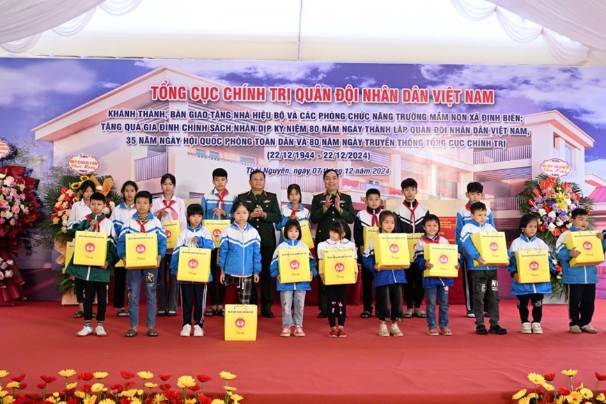 | Thượng tướng Trịnh Văn Quyết trao quà của Tổng cục Chính trị tặng Trường Mầm non Định Biên, huyện Định Hóa, tỉnh Thái Nguyên. Ảnh: VIỆT TRUNG |