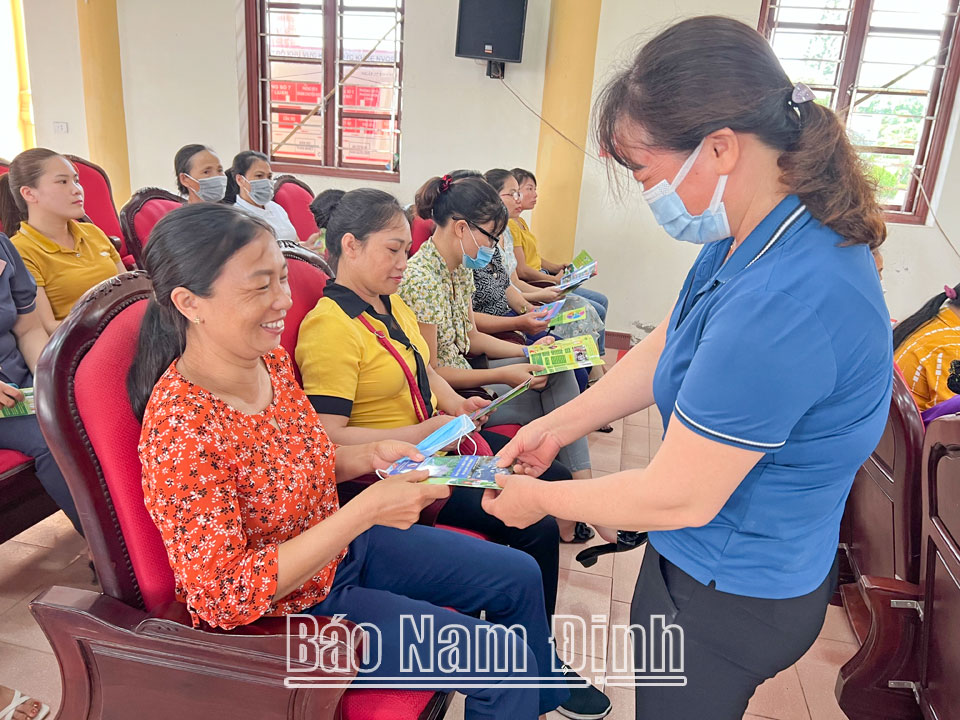 | Cán bộ phụ nữ huyện Giao Thuỷ tuyên truyền Luật Phòng, chống mua bán người cho hội viên. |