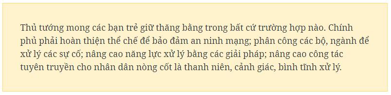 Thủ tướng cho rằng, phong trào sống được khi gắn với lợi ích của đất nước, của thanh niên; đề nghị cần tập trung 3 phong trào, đó là nâng cao năng lực công nghệ thông tin; học tập ngoại ngữ, phong trào giữ gìn vệ sinh, bảo vệ môi trường vừa gắn lợi ích quốc gia và của mỗi người.