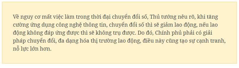 Thủ tướng nêu rõ, chuyển đổi số là yêu cầu khách quan và là một lựa chọn chiến lược, ưu tiên hàng đầu để phát triển Chính phủ số, công dân số. Thủ tướng cho rằng thanh niên phải đóng vai trò xung kích trong chuyển đổi số. Thủ tướng mong muốn thanh niên hiến kế để Chính phủ đẩy mạnh công cuộc này.