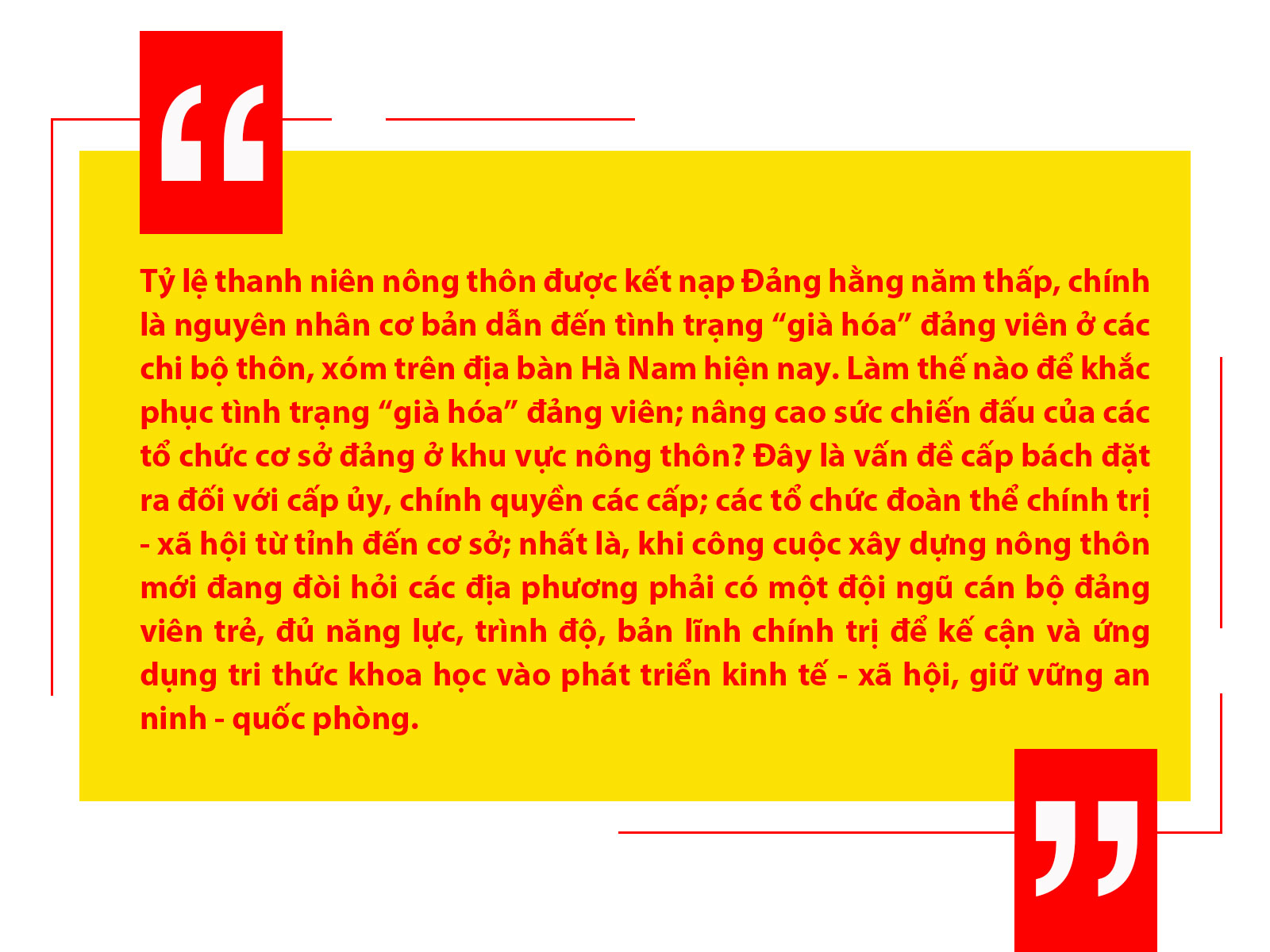Cũng về vấn đề này, anh Lại Tuấn Sơn, Bí thư Chi đoàn 7 (thị trấn Quế, Kim Bảng) chia sẻ: Hiện, chi đoàn có 40 ĐVTN, mỗi năm chi đoàn phấn đấu có 1 đoàn viên ưu tú được kết nạp vào Đảng nhưng trong 3 năm gần đây mới có 1 đoàn viên được kết nạp vào Đảng. Nguyên nhân căn bản vẫn là do các ĐVTN đi làm ở các công ty, các khu, cụm công nghiệp nên khó tập hợp và huy động họ tham gia vào các phong trào cách mạng do tổ chức đoàn phát động. Nhiều vấn đề tiêu cực trong xã hội đã tác động đến nhận thức, ý thức và động cơ phấn đấu của ĐVTN. Hoạt động của các tổ chức đoàn vẫn còn nặng về phong trào, bề nổi chưa thực sự thiết thực. Công tác phát triển đảng viên trẻ ở nông thôn hiện chưa thực sự được coi trọng, sự quan tâm của một số cấp ủy về công tác phát triển đảng viên trong thanh niên mới thể hiện ở quan điểm chủ trương, chưa có kế hoạch biện pháp cụ thể để tổ chức thực hiện; coi việc bồi dưỡng, giáo dục ĐVTN phấn đấu vào Đảng là trách nhiệm của đoàn thanh niên…
