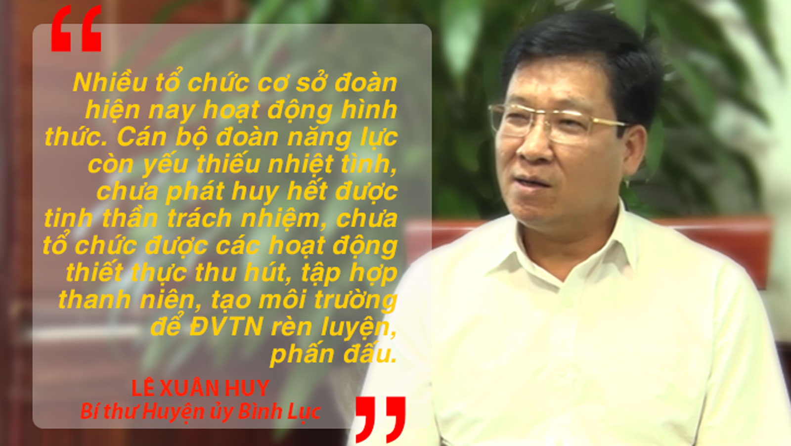 Tuy nhiên, vấn đề cốt yếu nhất, theo Bí thư Huyện ủy Bình Lục Lê Xuân Huy, vẫn do nhiều tổ chức cơ sở đoàn hiện nay hoạt động hình thức. Cán bộ đoàn năng lực còn yếu thiếu nhiệt tình, chưa phát huy hết được tinh thần trách nhiệm, chưa tổ chức được các hoạt động thiết thực thu hút, tập hợp thanh niên, tạo môi trường để ĐVTN rèn luyện, phấn đấu. Chương trình rèn luyện đoàn viên ở nhiều đơn vị chưa mang lại hiệu quả, chưa thực sự nâng cao chất lượng đoàn viên. Vai trò tham mưu của một số cấp bộ đoàn nhất là ở cơ sở trong công tác phát triển Đảng, xây dựng quy trình giới thiệu đoàn viên ưu tú kết nạp Đảng chưa tốt, hiệu quả còn hạn chế. Công tác tham mưu để cấp ủy giao nhiệm vụ cho đảng viên trẻ trong việc giúp đỡ đoàn viên ưu tú và phát huy vai trò nòng cốt, tính gương mẫu của đảng viên trẻ trong việc thực hiện nhiệm vụ của đoàn chưa đáp ứng được yêu cầu; một số nơi chưa phát huy được vai trò của đảng viên trẻ trong công tác giáo dục, bồi dưỡng, rèn luyện đoàn viên. Bên cạnh đó, một số cấp ủy cơ sở chưa thực sự chú trọng tới công tác lãnh đạo, chỉ đạo đối với công tác đoàn và phong trào thanh thiếu nhi nói chung, công tác phát triển Đảng trong thanh niên nói riêng. Thực tế, ở Bình Lục cho thấy, các tổ chức đoàn cơ sở mạnh sẽ quyết định đến chất lượng nguồn để giới thiệu cho Đảng…