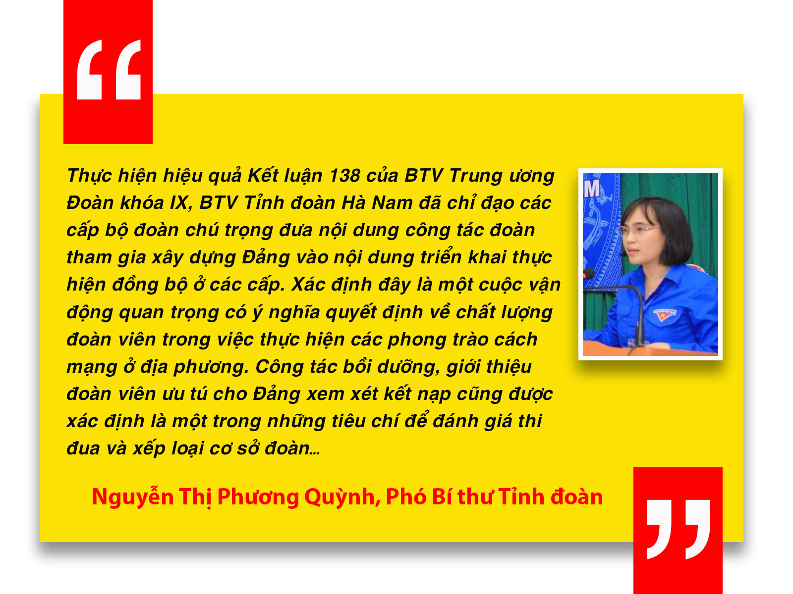 Theo chị Nguyễn Thị Phương Quỳnh, Phó Bí thư Tỉnh đoàn, nhận thức rõ vai trò của các tổ chức đoàn trong công tác tạo nguồn phát triển Đảng trong các đơn vị, địa phương, trên tinh thần thực hiện hiệu quả Kết luận 138 của BTV Trung ương Đoàn khóa IX, nhằm lan tỏa nội dung cuộc vận động đến các cấp bộ đoàn và ĐVTN, khi xây dựng nghị quyết nhiệm kỳ, các chương trình, kế hoạch công tác hằng năm, BTV Tỉnh đoàn Hà Nam đã chỉ đạo các cấp bộ đoàn chú trọng đưa nội dung công tác đoàn tham gia xây dựng Đảng vào nội dung triển khai thực hiện đồng bộ ở các cấp. Đồng thời, luôn xác định đây là một cuộc vận động quan trọng có ý nghĩa quyết định về chất lượng đoàn viên trong việc thực hiện các phong trào cách mạng ở địa phương. Công tác bồi dưỡng, giới thiệu đoàn viên ưu tú cho Đảng xem xét kết nạp cũng được xác định là một trong những tiêu chí để đánh giá thi đua và xếp loại cơ sở đoàn…
