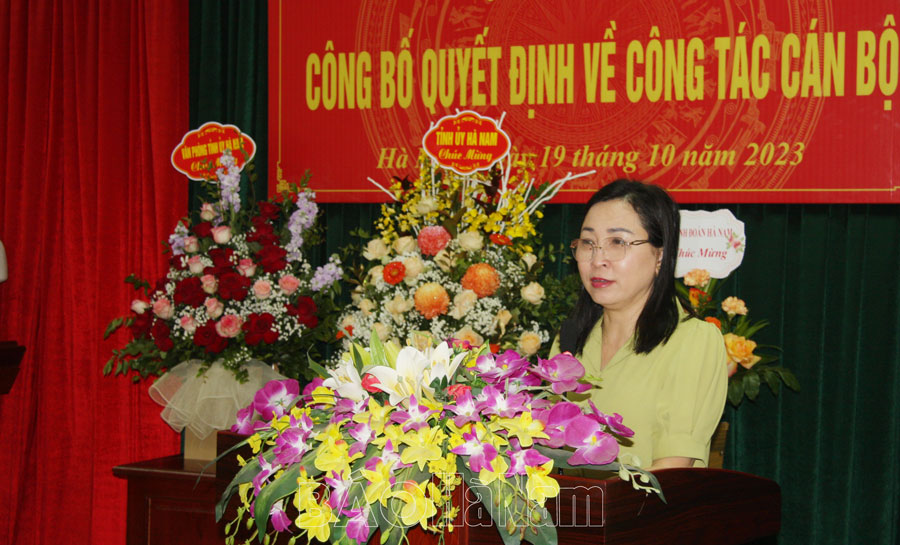 Đồng chí Đinh Thị Lụa, Phó Bí thư Thường trực Tỉnh ủy phát biểu, trao quyết định, tặng hoa chúc mừng đồng chí Nguyễn Thị Phương Quỳnh.
