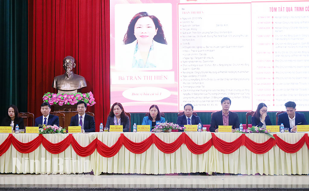Các ứng cử viên đại biểu Quốc hội khóa XVI thuộc Đơn vị bầu cử số 1, gồm các ông, bà: Lê Thị Nga, Ủy viên Trung ương Đảng, Phó Chủ nhiệm Thường trực Ủy ban Dân nguyện và Giám sát của Quốc hội; Trần Thị Hiền, Giám đốc Công ty cổ phần Xây dựng và Phát triển hạ tầng kỹ thuật Hà Nam, Phó Chủ tịch Hiệp hội Doanh nhân tỉnh, Phó Chủ tịch Hội Nữ doanh nhân tỉnh Ninh Bình; Phạm Tuấn Quang, chuyên viên Văn phòng Đoàn ĐBQH và HĐND tỉnh Ninh Bình; Phạm Thị Nhài, giáo viên Trường Mầm non Yên Định, xã Hải Hậu.