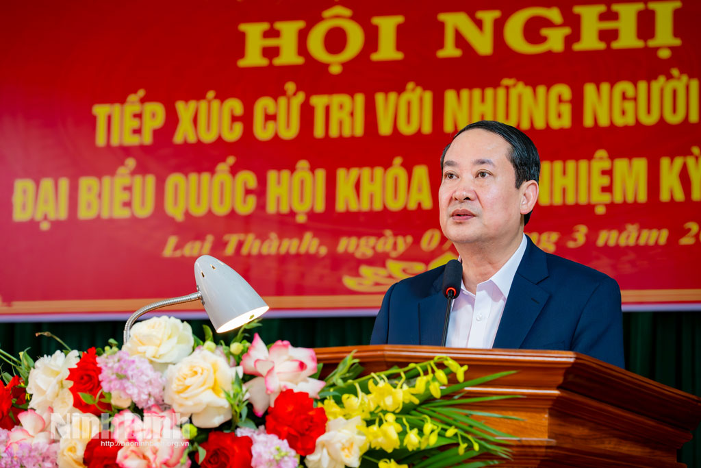Đồng chí nhấn mạnh, các ứng cử viên sẽ đặc biệt quan tâm đến những lĩnh vực mà cử tri quan tâm, qua đó góp phần thúc đẩy kinh tế-xã hội phát triển, nâng cao đời sống Nhân dân, xây dựng đất nước nói chung, tỉnh Ninh Bình nói riêng ngày càng phát triển nhanh, bền vững; phấn đấu sớm hiện thực hóa mục tiêu đưa Ninh Bình trở thành thành phố trực thuộc Trung ương vào năm 2030, với đặc trưng đô thị di sản thiên niên kỷ.