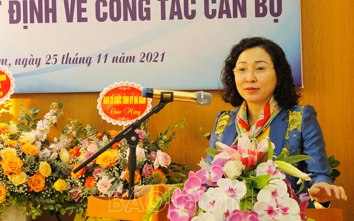 Đồng chí Đinh Thị Lụa, Phó Bí thư Thường trực Tỉnh ủy phát biểu, giao nhiệm vụ cho đồng chí Dương Xuân Khiêm