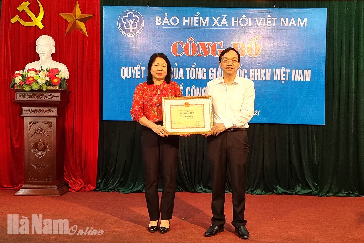 Đồng chí Trần Đình Liệu, Phó Tổng Giám đốc BHXH Việt Nam trao quyết định bổ nhiệm chức vụ Giám đốc BHXH tỉnh đối với ông Trần Mạnh Toàn.Đồng chí Đặng Đình Thoảng, Ủy viên Ban Thường vụ Tỉnh ủy, Trưởng Ban Tổ chức Tỉnh ủy trao tặng Bằng khen của Chủ tịch UBND tỉnh cho đồng chí Nguyễn Thị Thúy Liễu vì có nhiều thành tích trong công tác.