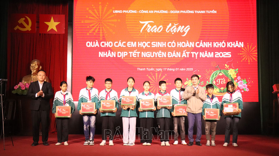 Lãnh đạo UBND phường trao quà cho các em học sinh có hoàn cảnh khó khăn nhân dịp Tết Ẩt Tỵ 2025.