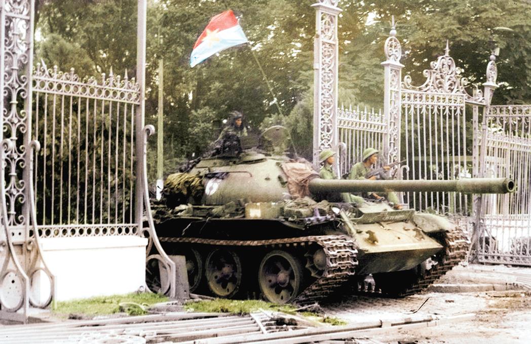 | Xe tăng quân giải phóng tiến vào Dinh Độc Lập trưa 30/4/1975. (Ảnh Trần Mai Hưởng) |