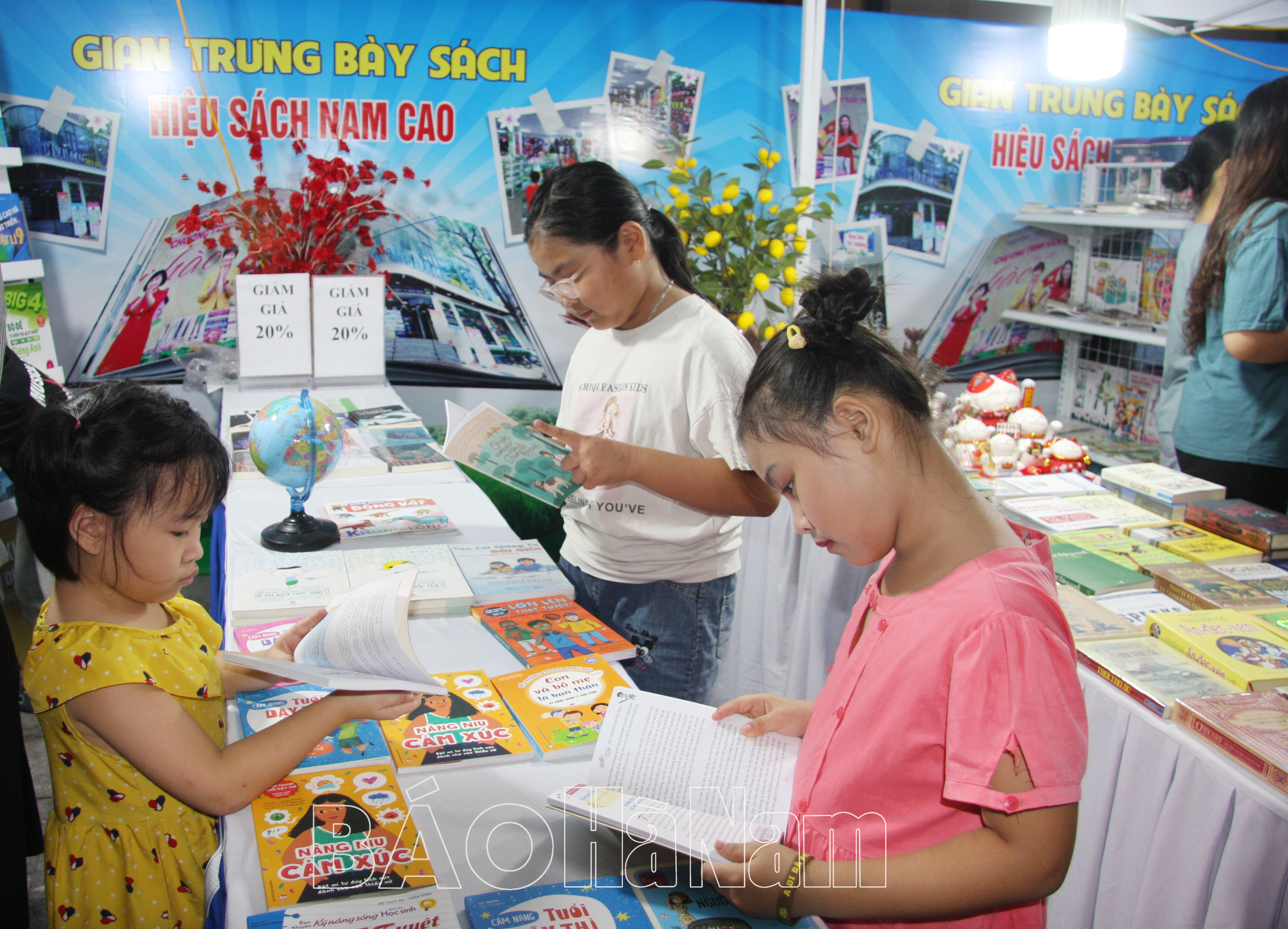 Các em học sinh đến tìm hiểu sách, truyện tại không gian tuyên truyền thư viện trưng bày sách.