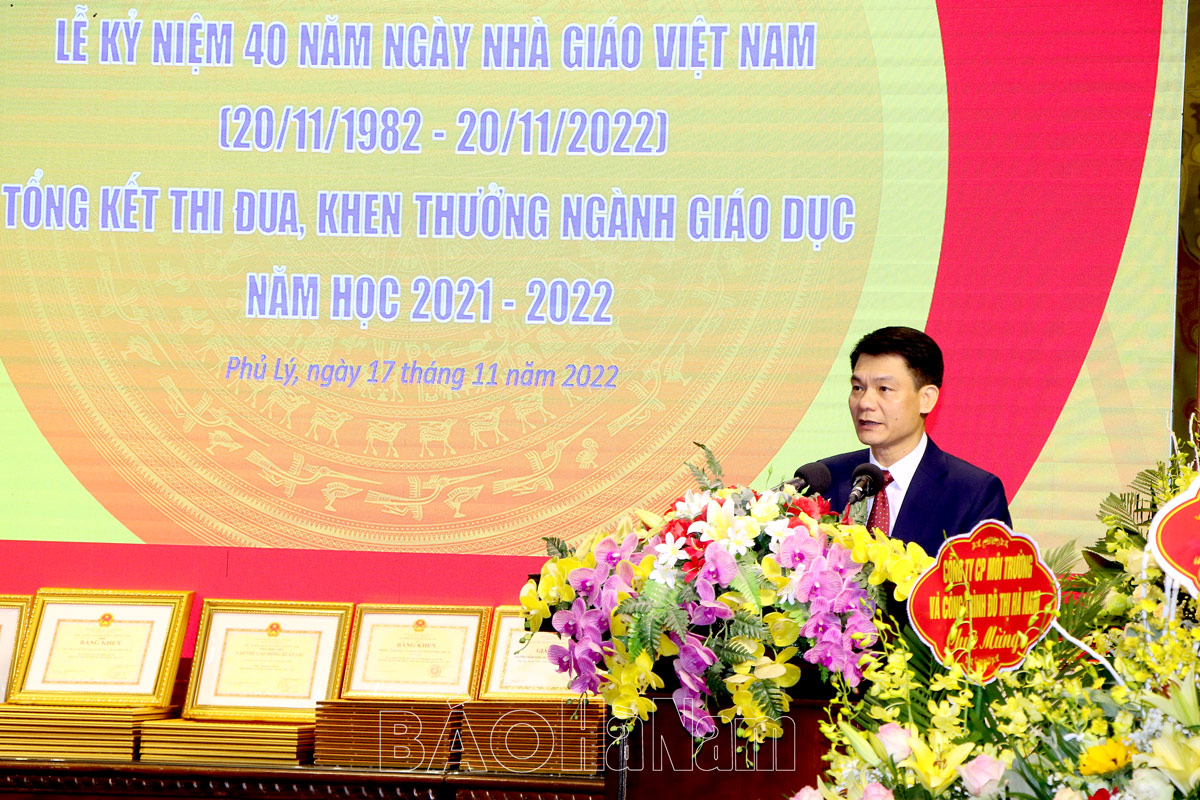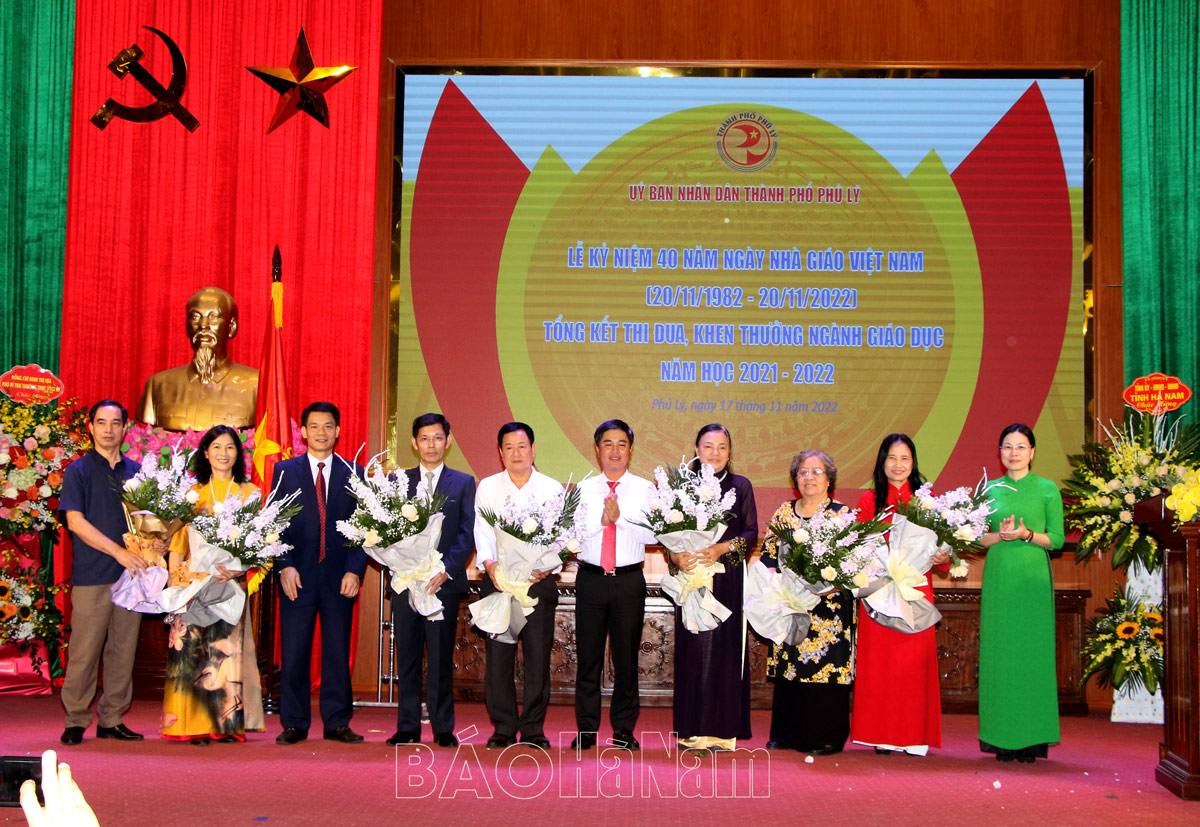 Chiều 17/11, Phòng Giáo dục và Đào tạo thành phố Phủ Lý long trọng tổ chức Lễ kỷ niệm 40 năm ngày Nhà giáo Việt Nam (20/11/1982-20/11/2022) và tổng kết thi đua khen ngành Giáo dục năm học 2021-2022, đón nhận Huân chương Lao động hạng Nhất. Dự buổi lễ có các đồng chí: Nguyễn Đức Toàn, Ủy viên Ban Thường vụ Tỉnh ủy, Bí thư Thành ủy, Chủ tịch HĐND thành phố; Trần Xuân Dưỡng, Tỉnh ủy viên, Phó Chủ tịch UBND tỉnh.