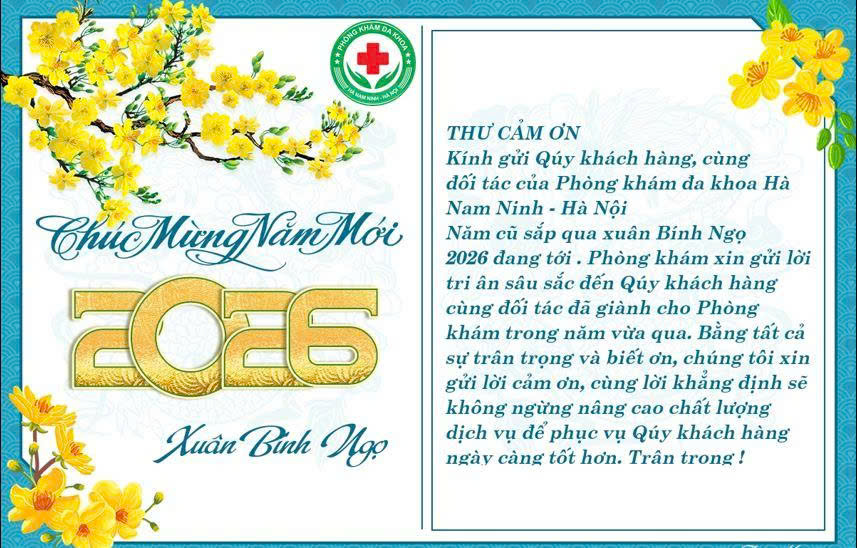 Năm cũ sắp qua, Xuân Bính Ngọ 2026 sắp đến. Bằng tất cả sự trân trọng Phòng khám đa khoa Hà Nam Ninh Hà Nội xin gửi lời chân thành cảm ơn Quý khách hàng đã tin tưởng lựa chọn và đồng hành cùng Phòng khám trong suốt thời gian qua. Sự ủng hộ của Quý khách là động lực để Phòng khám không ngừng cải thiện chất lượng dịch vụ, nâng cao hiệu quả khám chữa bệnh và thái độ phục vụ.