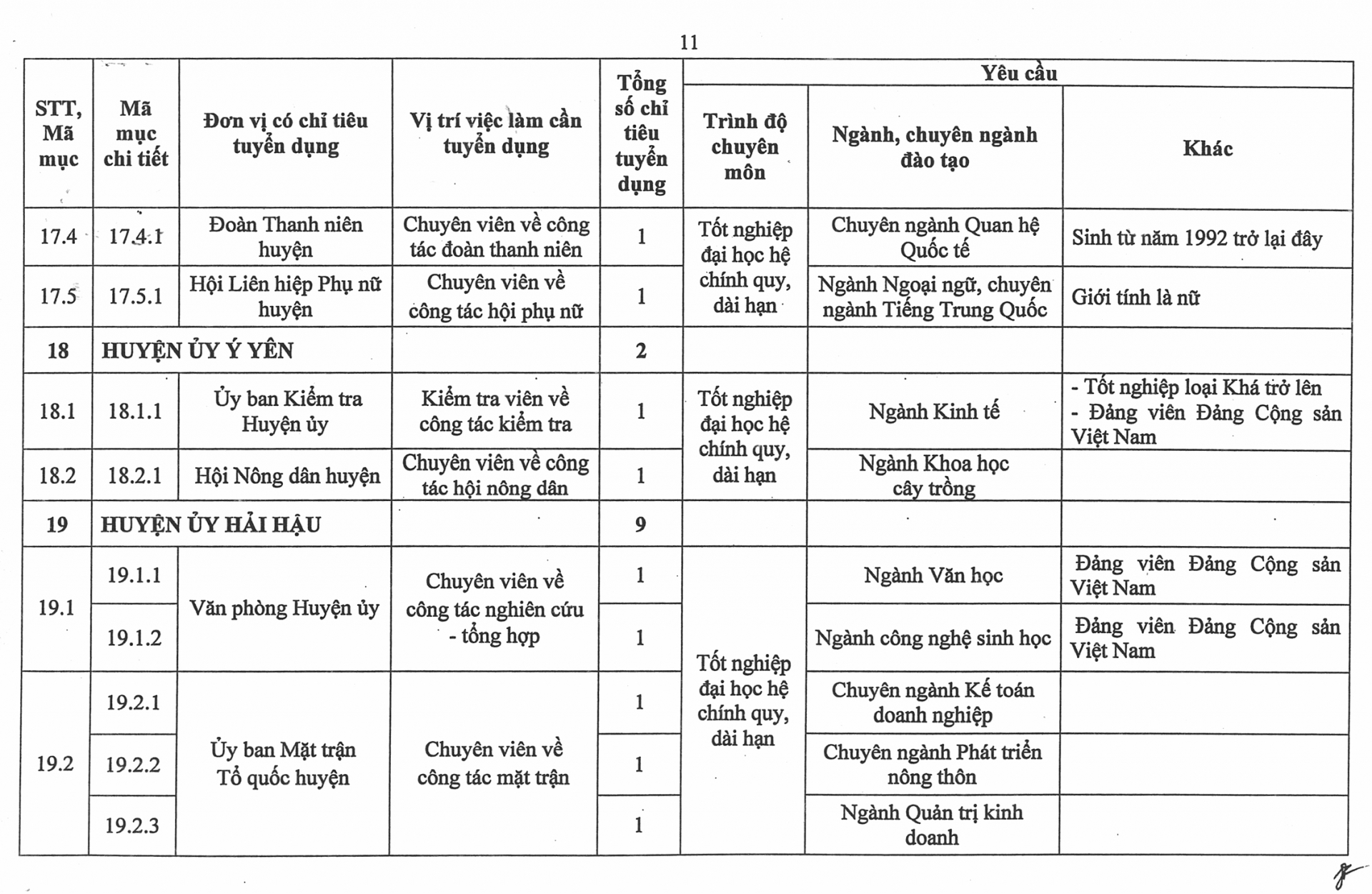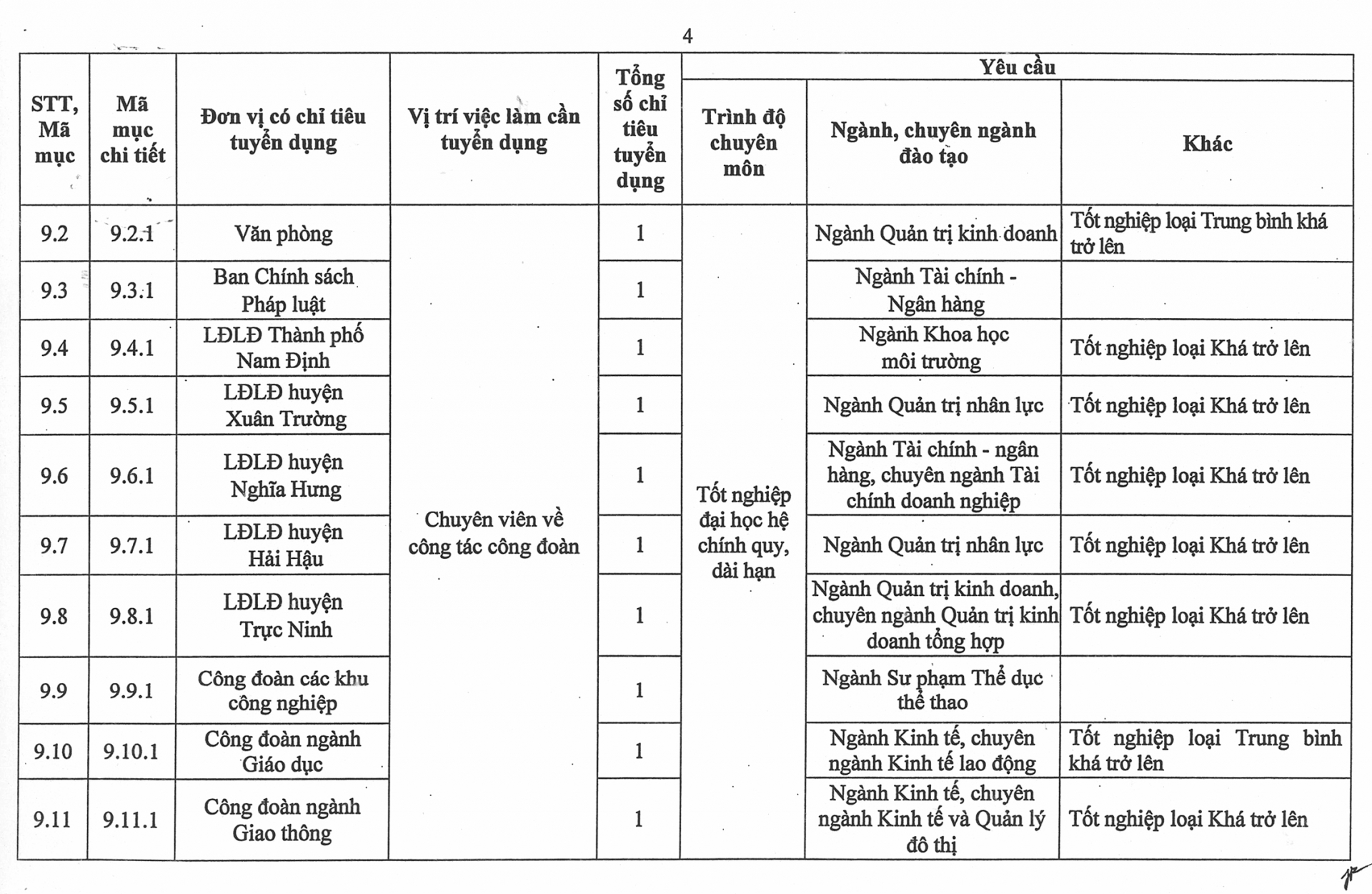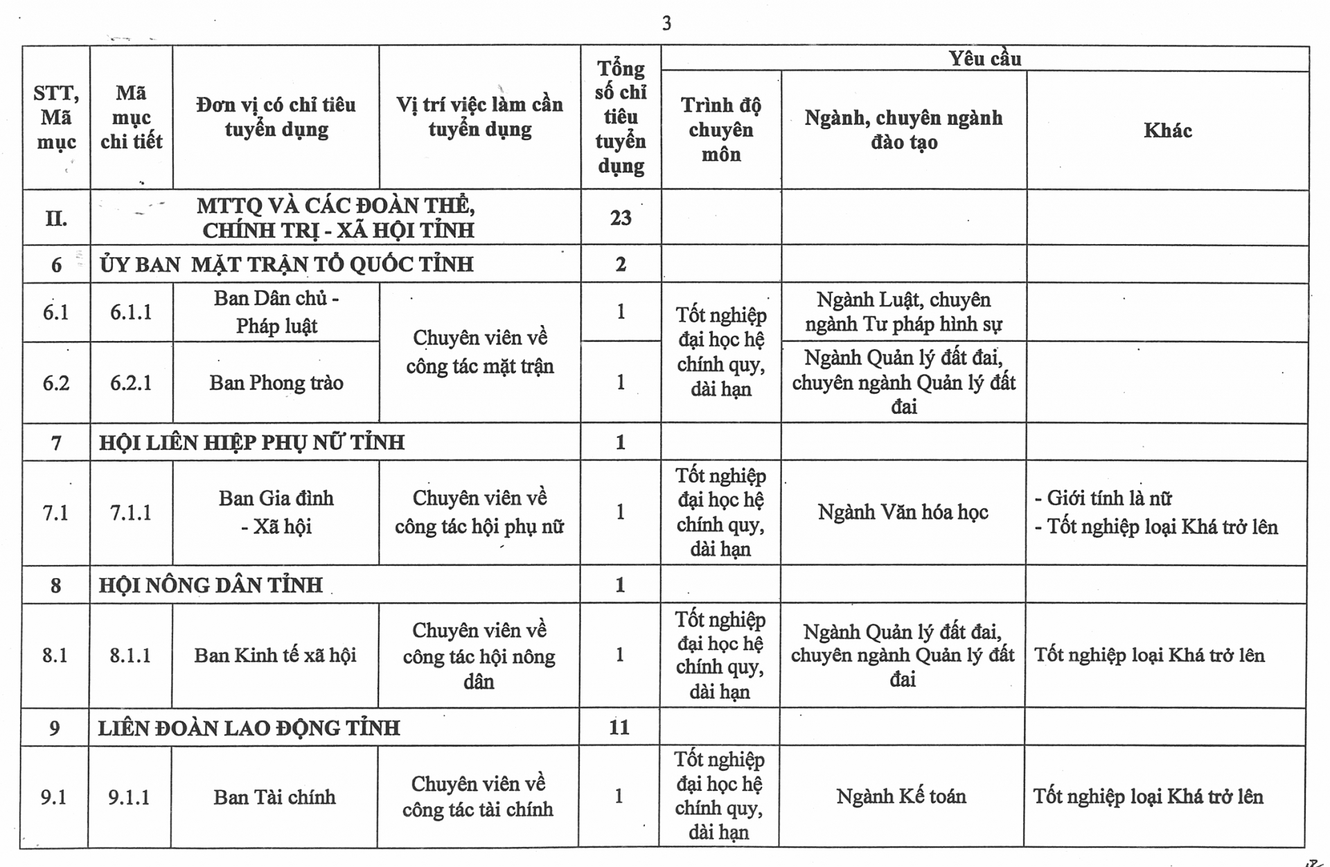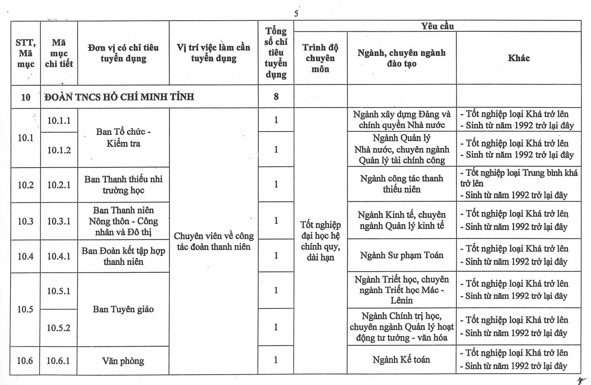 Phụ lục số lượng chỉ tiêu, yêu cầu cụ thể của từng vị trí việc làm cần tuyển