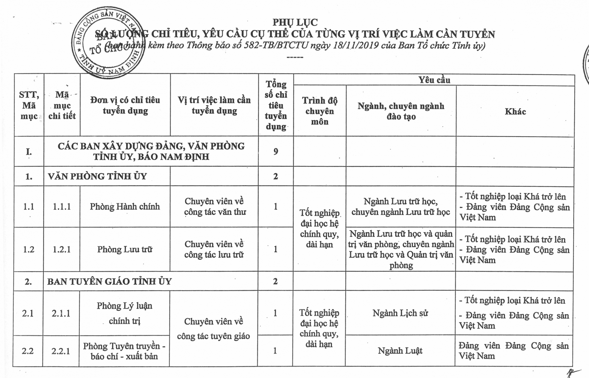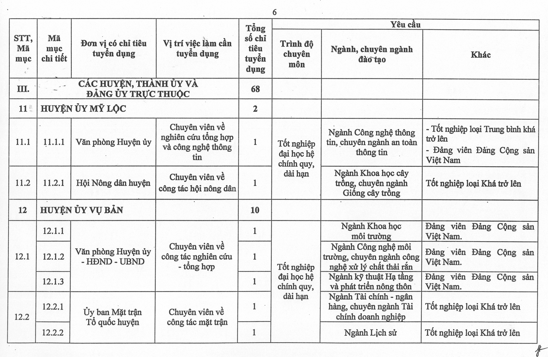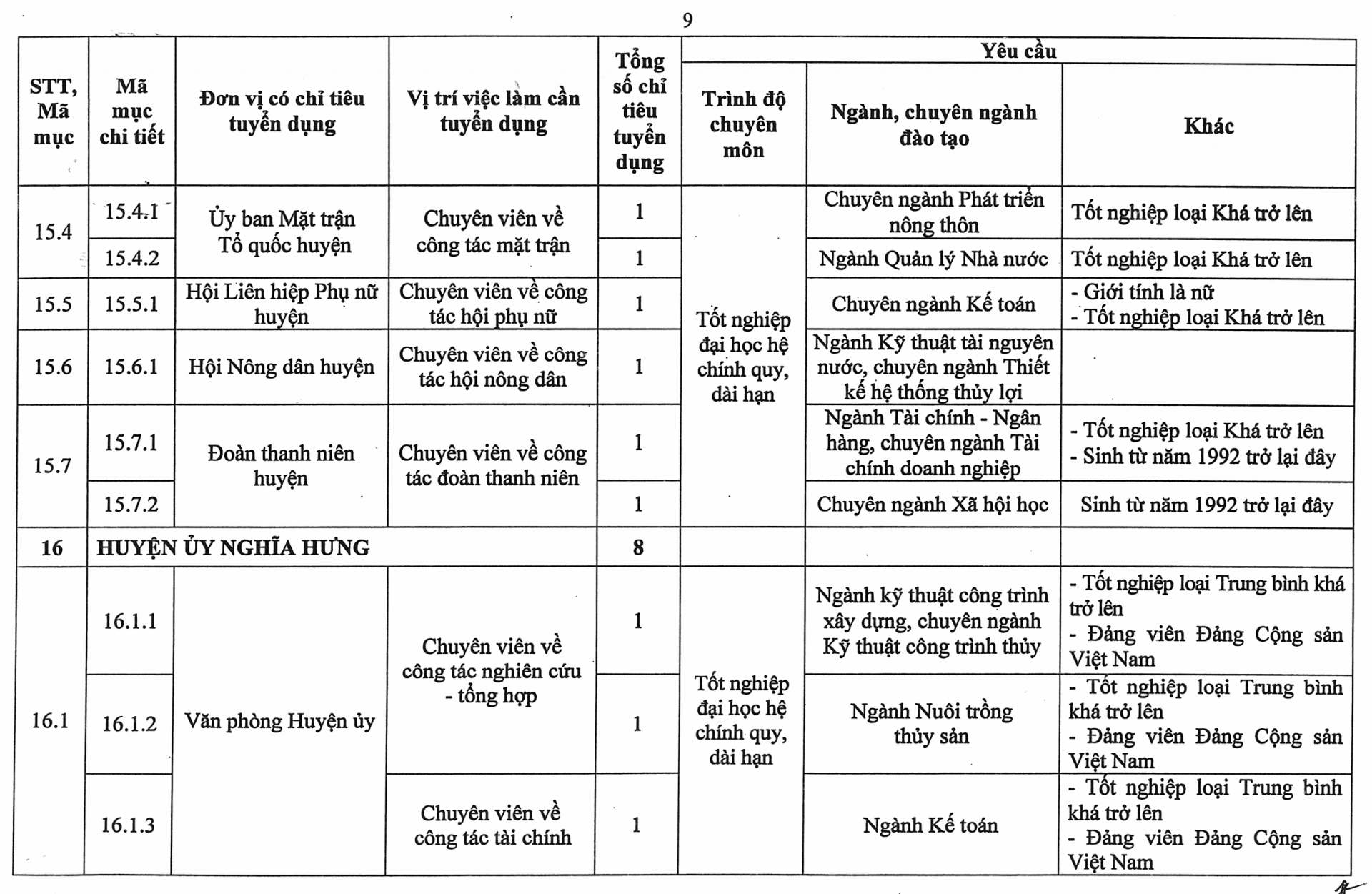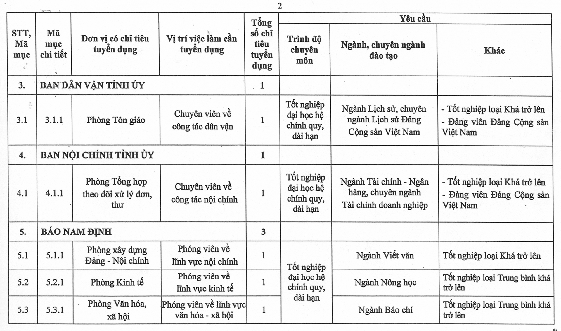 Phụ lục số lượng chỉ tiêu, yêu cầu cụ thể của từng vị trí việc làm cần tuyển