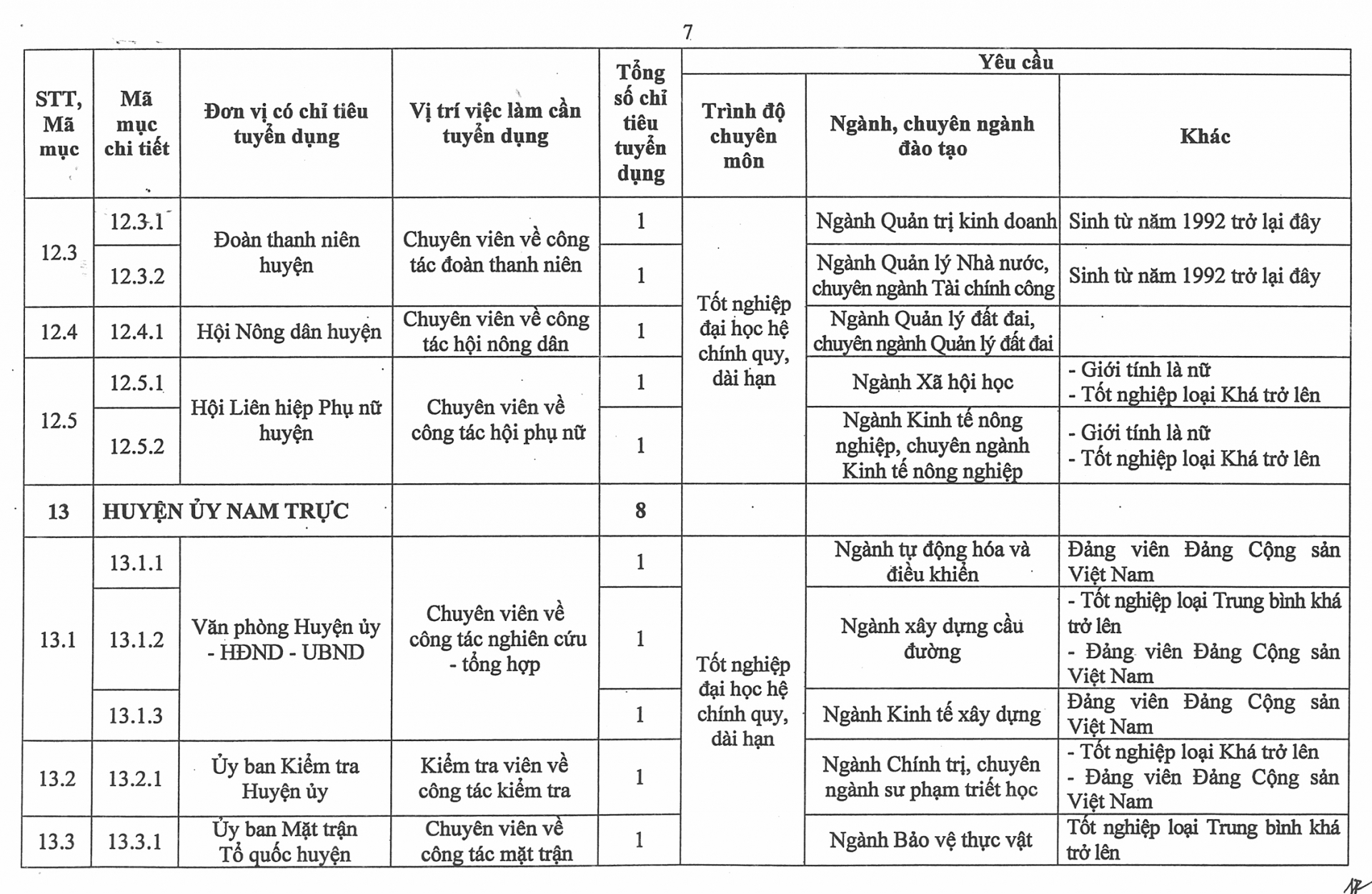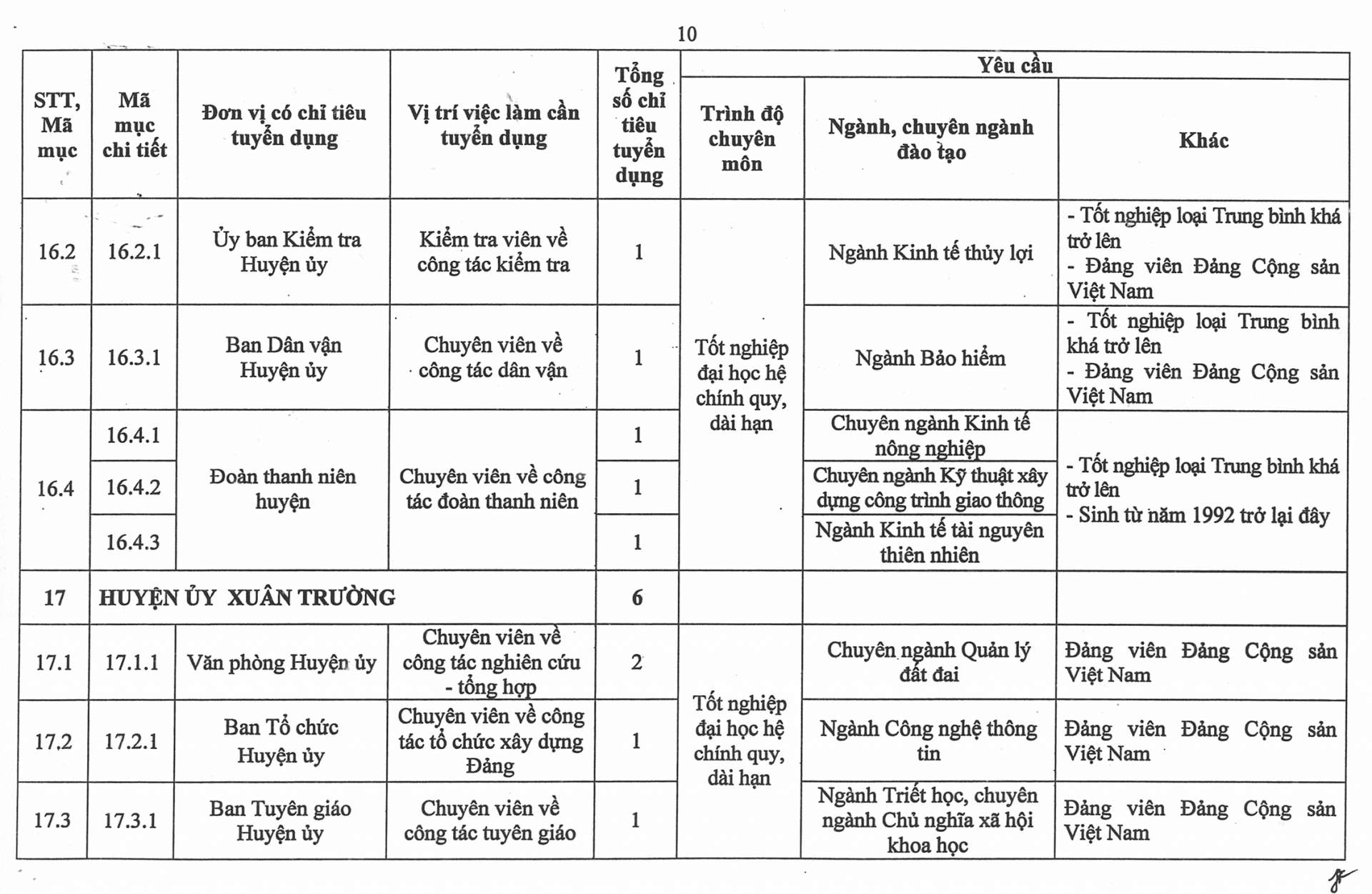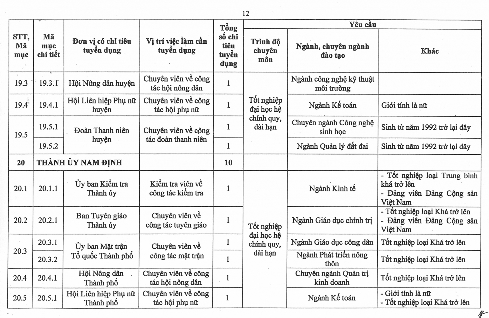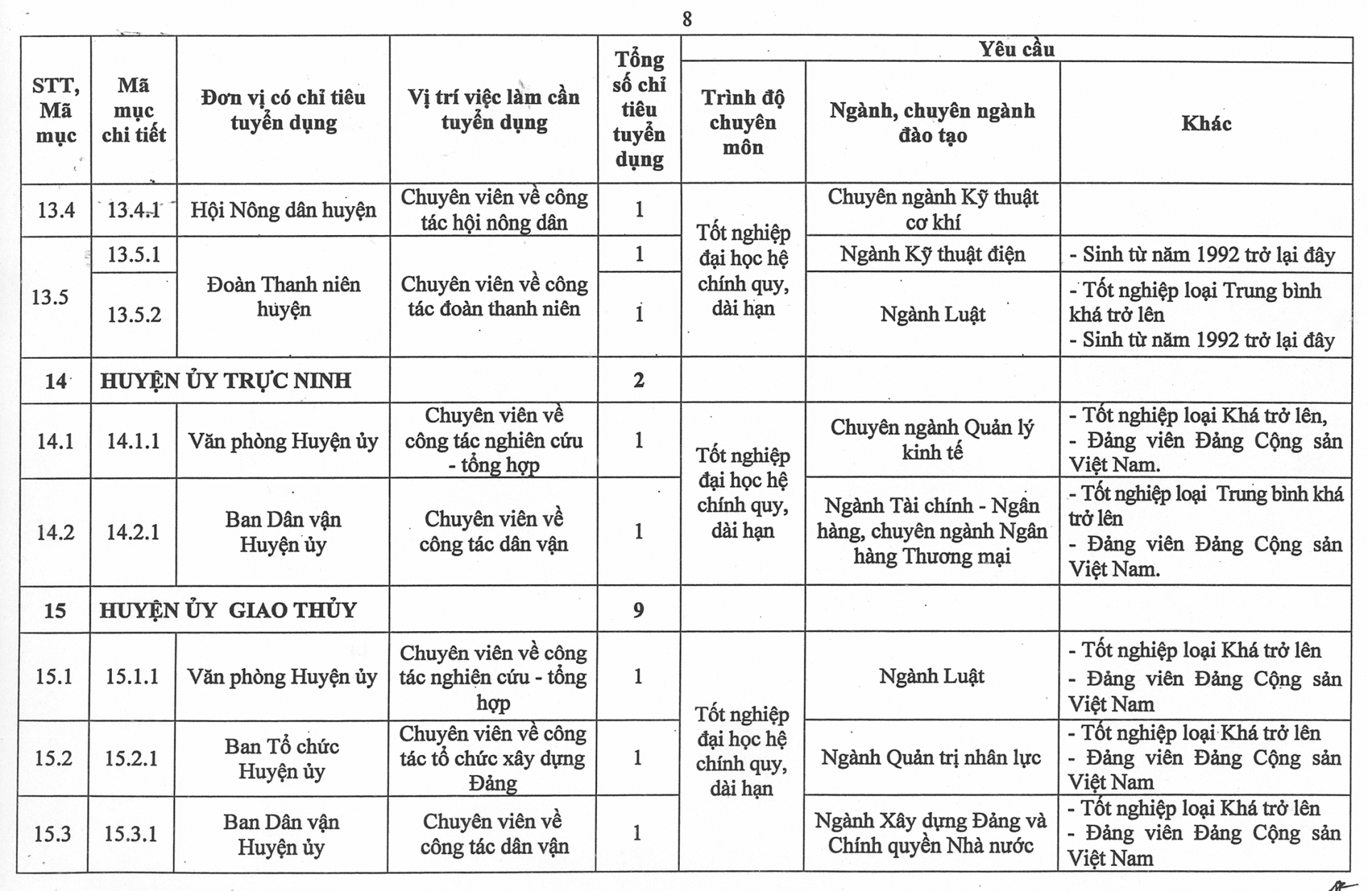 Phụ lục số lượng chỉ tiêu, yêu cầu cụ thể của từng vị trí việc làm cần tuyển