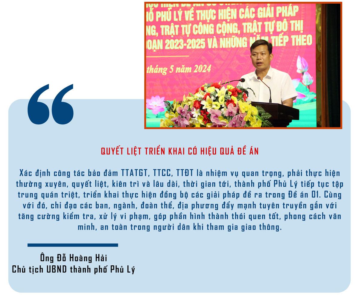 Thành phố Phủ Lý là trung tâm chính trị, kinh tế, văn hóa, xã hội của tỉnh nên mật độ giao thông luôn đông đúc. Vài năm trở lại đây, thành phố được coi là điểm nóng, phức tạp về an ninh trật tự (ANTT), TTATGT, TTCC, TTĐT. Trước thực trạng đó, thời gian qua, các đơn vị, lực lượng chức năng thành phố đã triển khai đồng bộ nhiều giải pháp nhằm kiềm chế, kéo giảm tai nạn giao thông (TNGT), song do nhận thức của một bộ phận người dân còn hạn chế, dẫn đến tình hình ANTT, TTATGT, TTCC, TTĐT trên địa bàn vẫn tiềm ẩn nhiều nguy cơ diễn biến phức tạp. Ngay sau khi Đề án 01 của UBND thành phố được ban hành, cấp ủy, chính quyền các cấp thành phố Phủ Lý đã huy động sự vào cuộc của cả hệ thống chính trị để triển khai thực hiện đồng bộ, kịp thời, bài bản nhằm quyết tâm xây dựng đô thị văn minh, hướng đến mục tiêu trở thành đô thị loại I trước năm 2030.