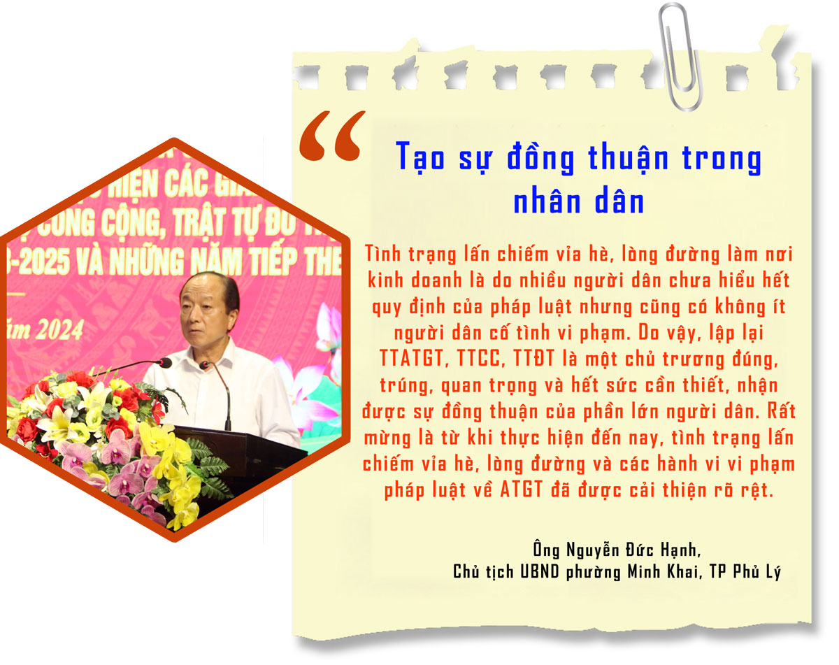 Với mục tiêu thiết lập trật tự, kỷ cương về trật tự an toàn giao thông (TTATGT), trật tự công cộng (TTCC), trật tự đô thị (TTĐT), mỹ quan đô thị, ngày 10/4/2023, UBND thành phố Phủ Lý triển khai Đề án 01 về thực hiện các giải pháp bảo đảm TTATGT, TTCC, TTĐT trên địa bàn thành phố giai đoạn 2023-2025 và những năm tiếp theo (Đề án 01). Qua hơn 1 năm triển khai thực hiện, Đề án 01 đã phát huy hiệu quả thiết thực, huy động sức mạnh tổng hợp của cả hệ thống chính trị, từng bước thiết lập trật tự, kỷ cương, tạo sự thông thoáng, an toàn trên mỗi tuyến đường, góp phần xây dựng văn hóa giao thông an toàn, văn minh.