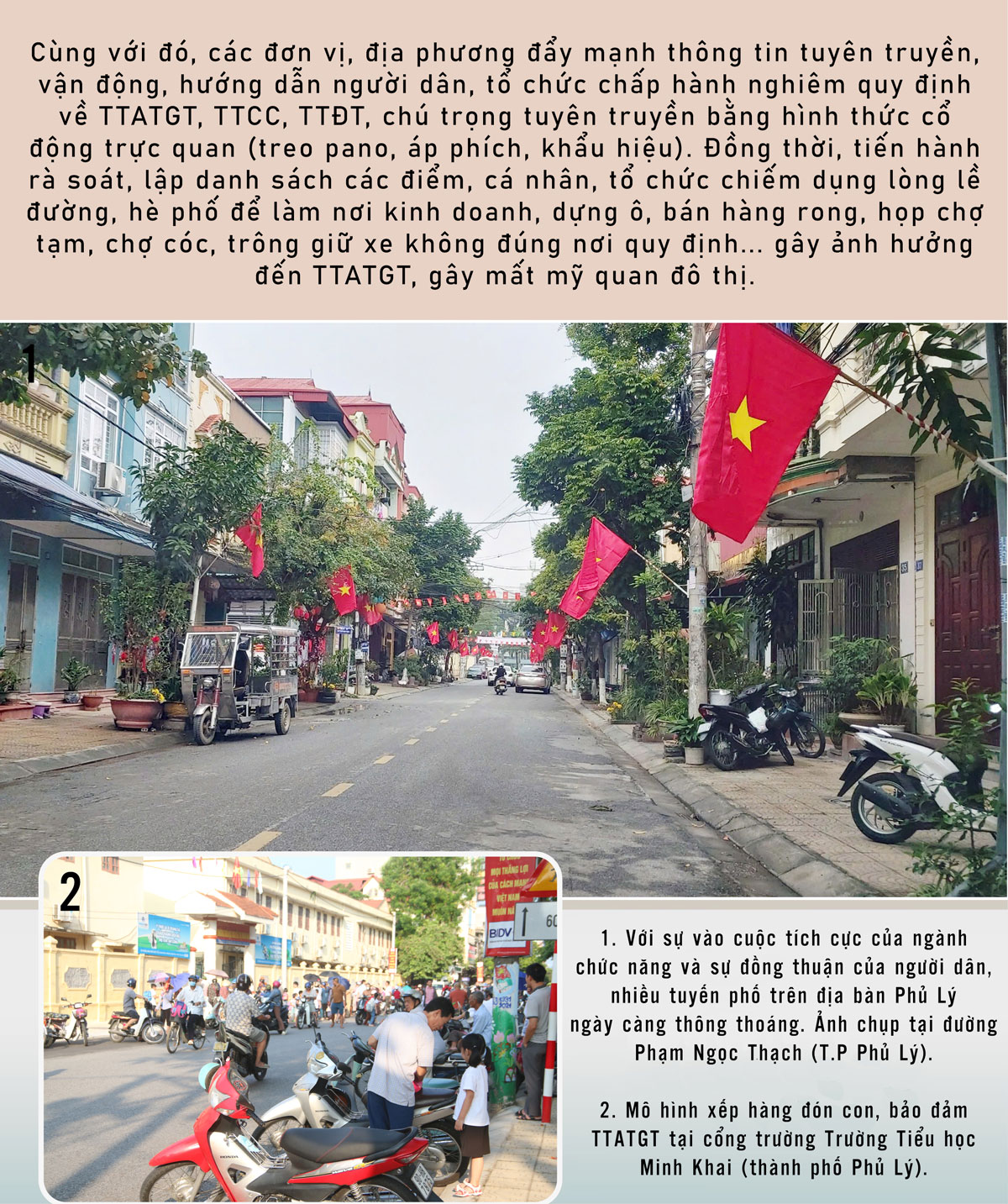 Có thể khẳng định, sau 1 năm triển khai Đề án 01, việc thực hiện các giải pháp bảo đảm TTATGT, TTCC, TTĐT trên địa bàn thành phố Phủ Lý đã bước đầu mang lại hiệu quả thiết thực, rõ nét. Tư duy, nhận thức của lực lượng chức năng, chính quyền địa phương và người dân trong công tác bảo đảm TTATGT, TTCC, TTĐT có chuyển biến tích cực; tác phong, lề lối làm việc, quy trình công tác TTKS, xử lý vi phạm, tiếp xúc, tuyên truyền, hướng dẫn vận động nhân dân, doanh nghiệp được thực thi đồng bộ, bài bản; ý thức người tham gia giao thông được nâng lên, văn hóa giao thông được cải thiện rõ rệt.