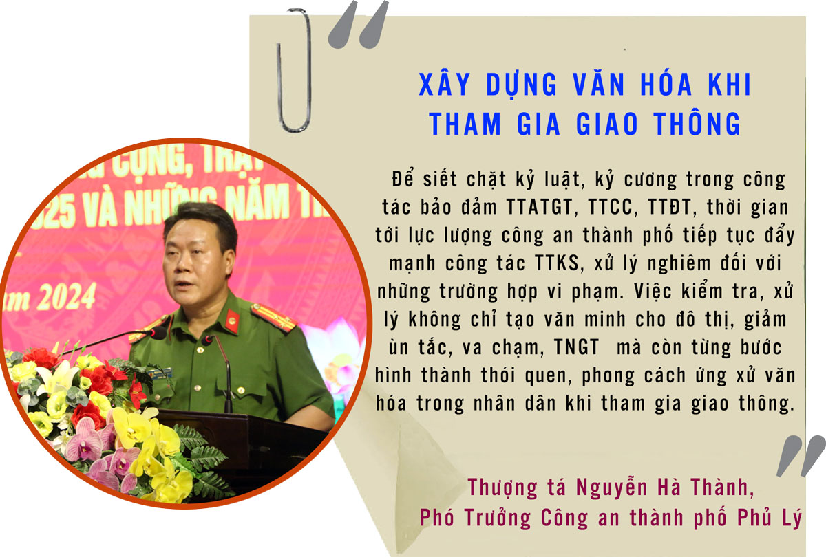 Thực hiện Đề án 01, hơn 1 năm qua, các cấp, ngành, lực lượng chức năng của thành phố Phủ Lý đã tăng cường kiểm tra, rà soát, xử lý những vi phạm nhằm bảo đảm TTATGT, TTCC, TTĐT trên địa bàn. Lực lượng công an thành phố đã huy động, phân công trên 50 nghìn lượt cán bộ, chiến sĩ thực hiện cắm chốt tại một số nút giao thông trọng điểm, tăng cường tuần tra, kiểm soát (TTKS) lưu động tại các tuyến đường.