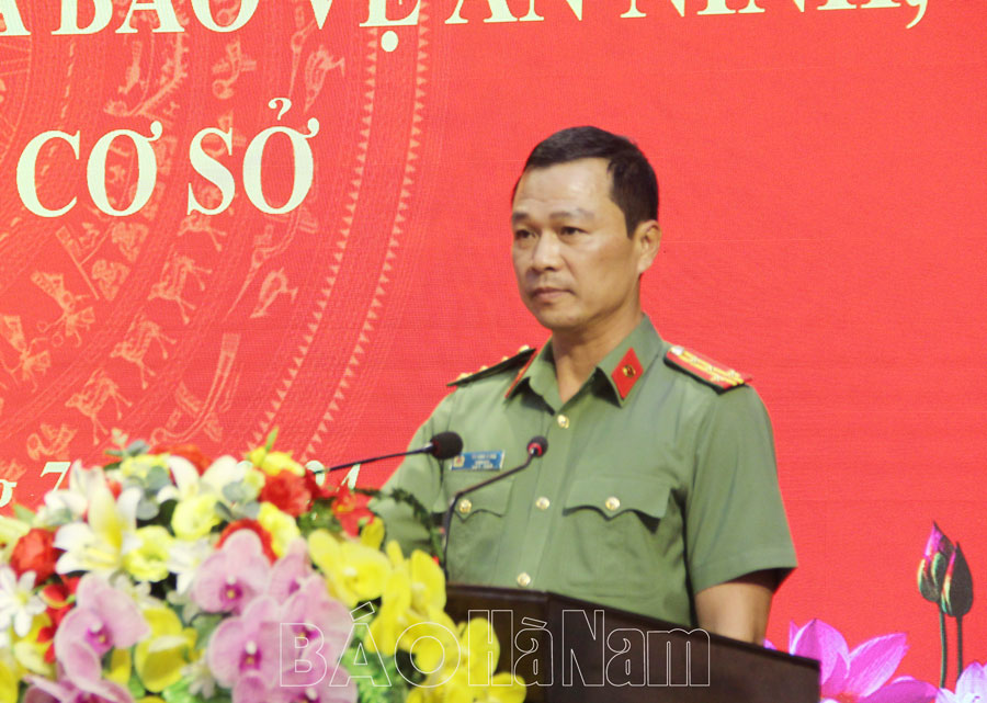 Đại tá Tô Anh Dũng, Ủy viên BTV Tỉnh ủy, Giám đốc Công an tỉnh phát biểu tại hội nghị.