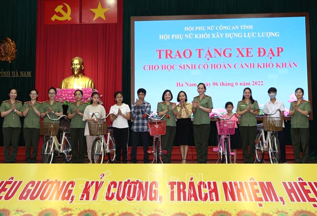 Không chỉ duy trì, làm tốt hoạt động nhân đạo “mẹ đỡ đầu”, phụng dưỡng người già neo đơn trong nhiều năm qua, các đơn vị Hội phụ nữ trong Công an tỉnh Hà Nam còn tích cực tham gia các phong trào, hoạt động nhân đạo, từ thiện, vì cộng đồng. Nhân dịp Tết nguyên đán Nhâm Dần 2022, các đơn vị đã tổ chức thăm, tặng 93 suất quà cho các gia đình chính sách, phụ nữ, trẻ em, gia đình phụ nữ Công an tỉnh có hoàn cảnh khó khăn với tổng số tiền gần 70 triệu đồng. Hội phụ nữ Công an tỉnh phối hợp với chính quyền địa phương trao tặng 5 chiếc xe đạp cho trẻ em có hoàn cảnh đặc biệt khó khăn tại xã Cách Linh, huyện Quảng Hòa, tỉnh Cao Bằng với tổng số tiền gần 10 triệu đồng.