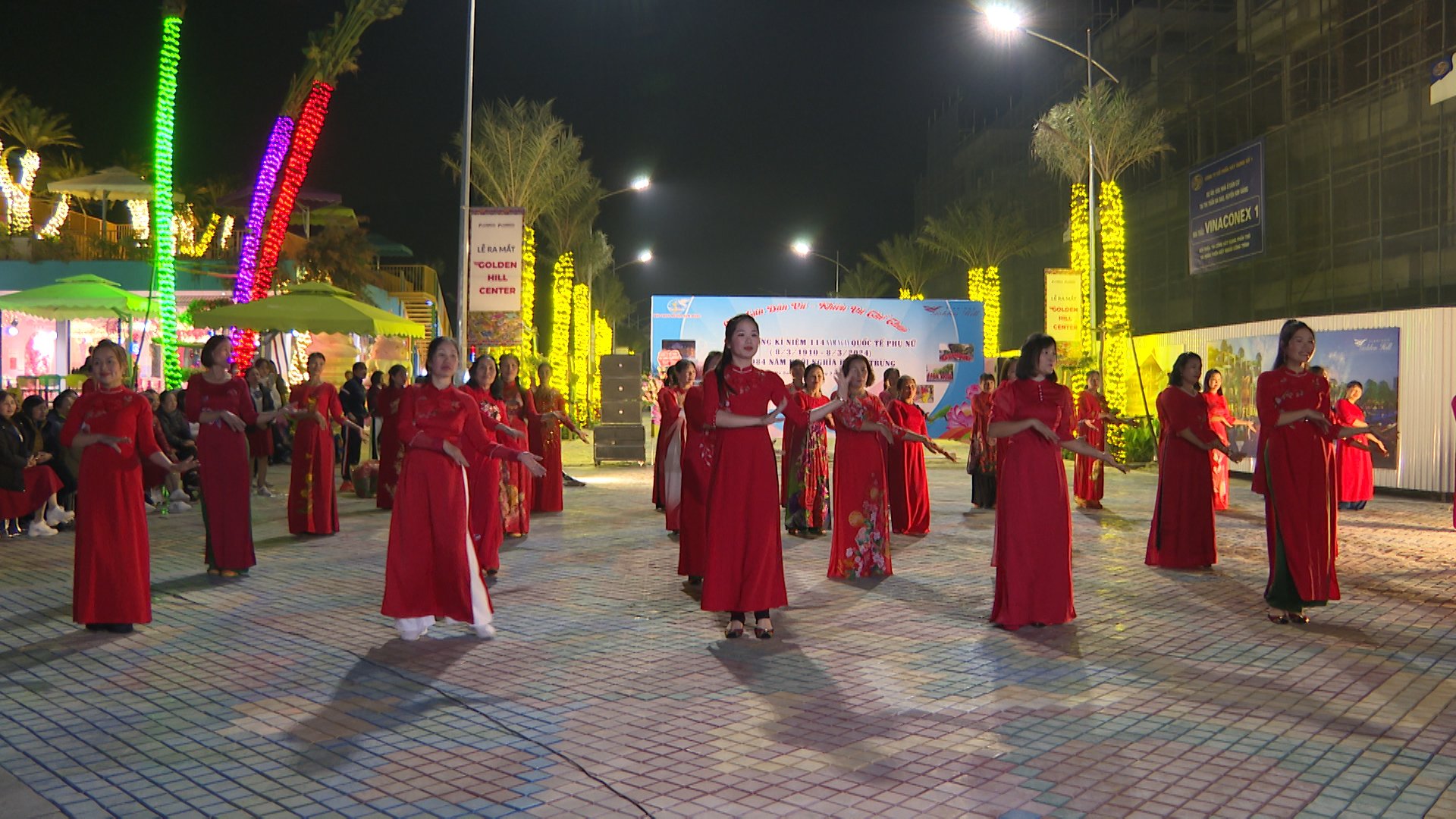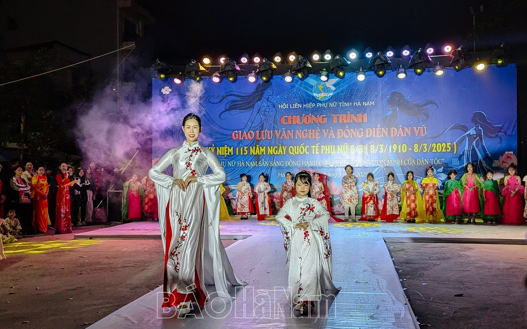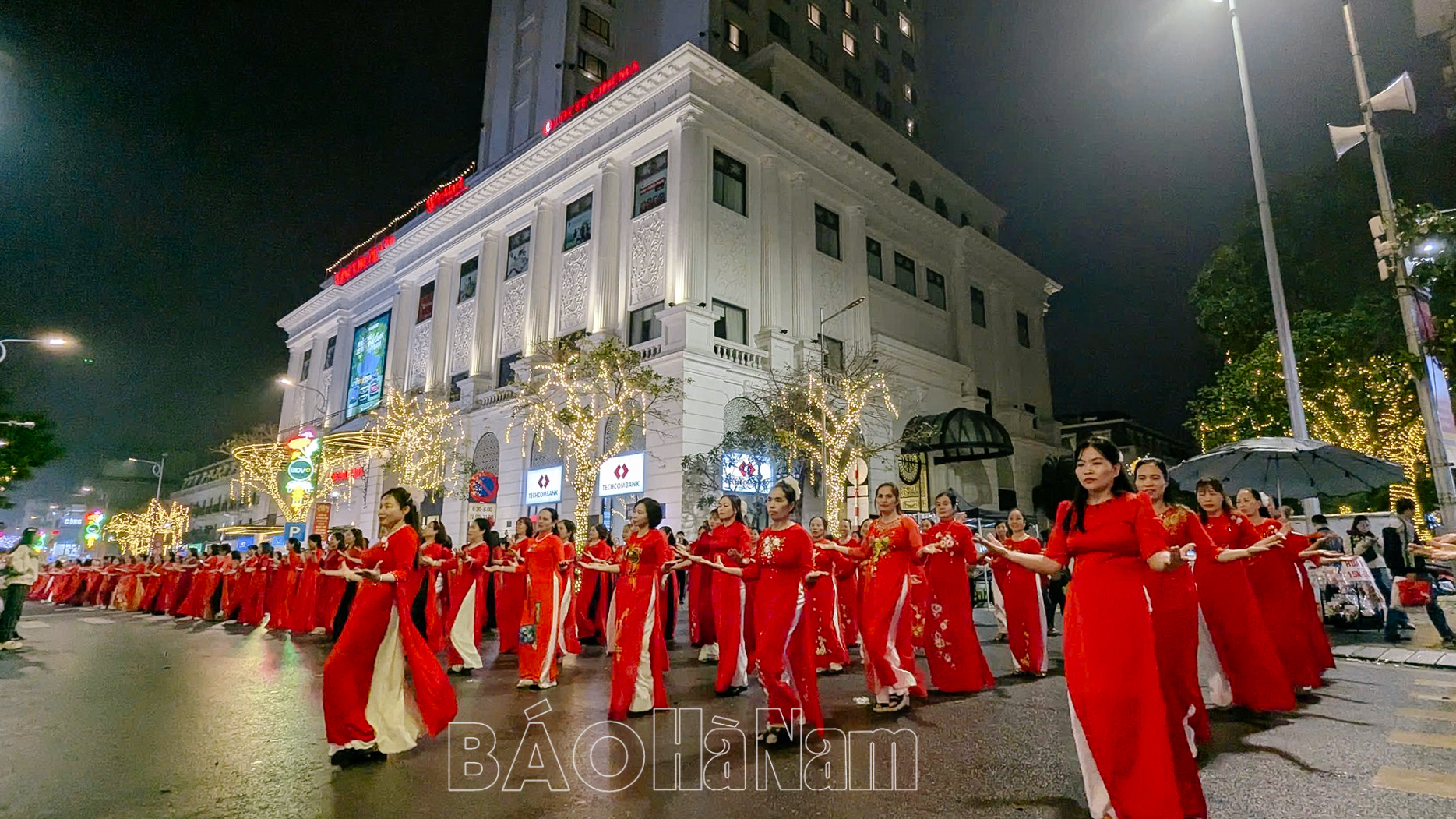 Đặc biệt là phần đồng diễn ấn tượng của hơn 1.000 cán bộ, hội viên phụ nữ trong trang phục áo dài, thể hiện tinh thần “Áo dài cộng đồng” của phụ nữ Hà Nam tại phố đi bộ thành phố Phủ Lý.