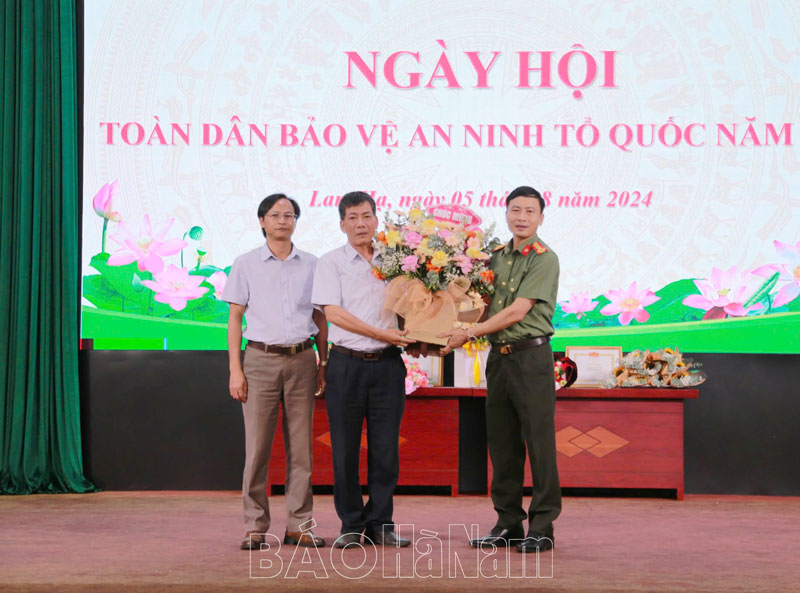 Đại diện lãnh đạo Công an tỉnh tặng hoa chúc mừng cán bộ, nhân dân phường Lam Hạ.