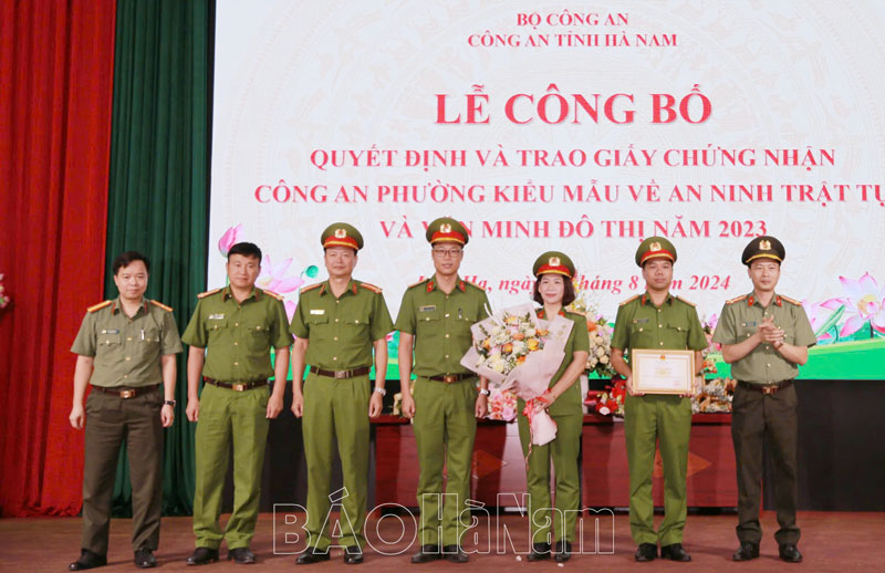 Đại diện lãnh đạo Công an tỉnh trao giấy chứng nhận và tặng hoa chúc mừng Công an phường Lam Hạ.