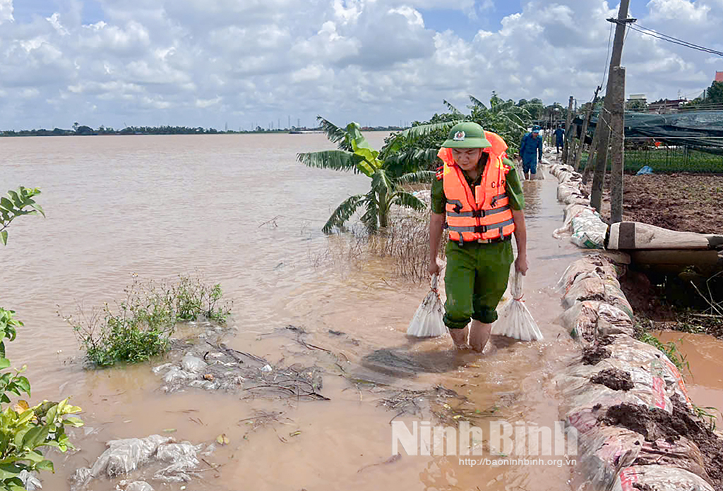 Lực lượng Công an phường Thiên Trường tham gia chống lũ