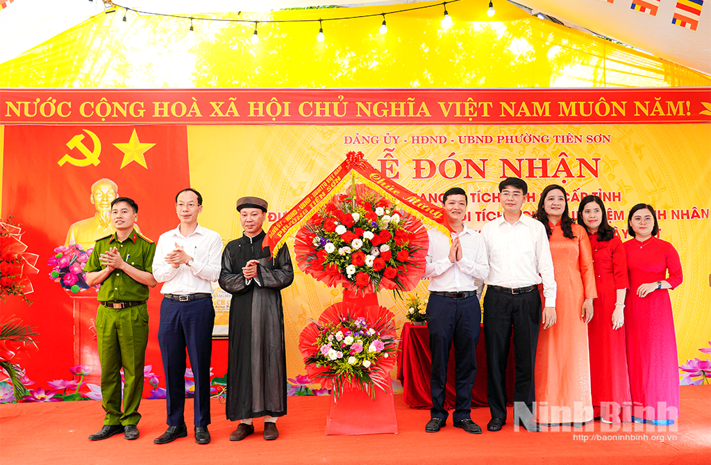 Lãnh đạo phường Tiên Sơn tặng hoa chúc mừng đại diện Ban quản lý Di tích.