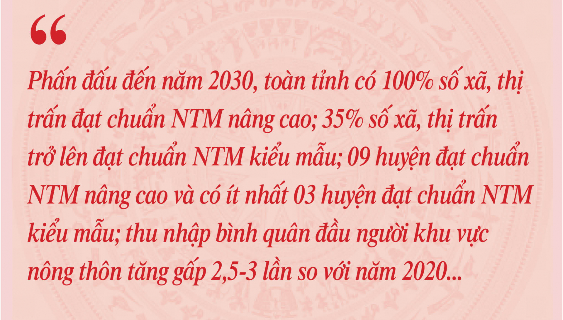 Kế thừa, phát huy những thành tựu, kinh nghiệm trong thời gian qua; với tinh thần “nhìn thẳng, đánh giá đúng và làm thực chất hơn nữa” để hướng đến những mục tiêu mới, cao hơn, các cấp ủy, chính quyền của tỉnh đã và đang tập trung lãnh đạo, chỉ đạo triển khai thực hiện Chương trình xây dựng NTM trên địa bàn tỉnh theo tinh thần Nghị quyết 06-NQ/TU của Ban Chấp hành Đảng bộ tỉnh về xây dựng NTM nâng cao, kiểu mẫu giai đoạn 2021-2025 và Chương trình hành động thực hiện Nghị quyết Hội nghị lần thứ năm Ban Chấp hành Trung ương Đảng khóa XIII về nông nghiệp, nông dân, nông thôn đến năm 2030, tầm nhìn đến năm 2045, hướng đến xây dựng nền nông nghiệp sinh thái, nông thôn hiện đại, nông dân văn minh. Theo đó, phấn đấu đến năm 2030, toàn tỉnh có 100% số xã, thị trấn đạt chuẩn NTM nâng cao; 35% số xã, thị trấn trở lên đạt chuẩn NTM kiểu mẫu; 09 huyện đạt chuẩn NTM nâng cao và có ít nhất 03 huyện đạt chuẩn NTM kiểu mẫu; thu nhập bình quân đầu người khu vực nông thôn tăng gấp 2,5-3 lần so với năm 2020; tốc độ tăng trưởng giá trị sản xuất ngành nông nghiệp đạt bình quân khoảng 2,0-2,5%/năm; tăng năng suất lao động nông nghiệp bình quân từ 5,5-6%/năm; tốc độ tăng trưởng công nghiệp, dịch vụ nông thôn đạt bình quân 10%/năm.
