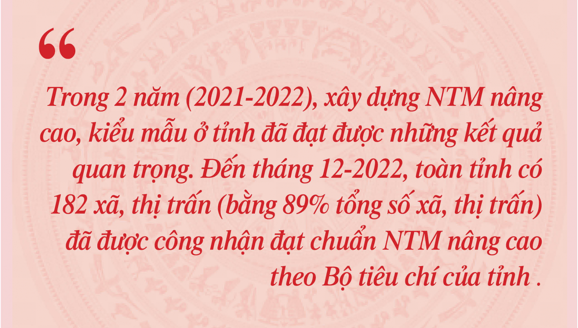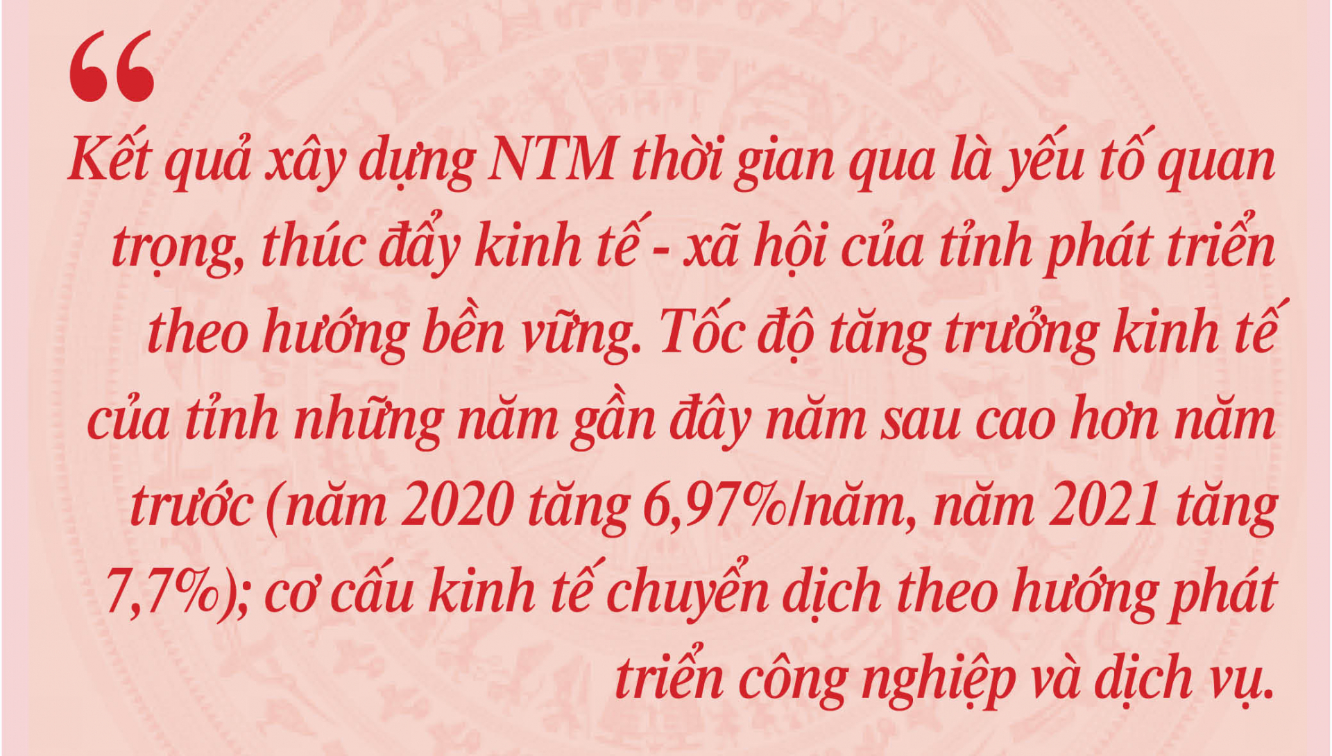 Kết quả xây dựng NTM thời gian qua là yếu tố quan trọng, thúc đẩy kinh tế - xã hội của tỉnh phát triển theo hướng bền vững. Tốc độ tăng trưởng kinh tế của tỉnh những năm gần đây năm sau cao hơn năm trước (năm 2020 tăng 6,97%/năm, năm 2021 tăng 7,7%); cơ cấu kinh tế chuyển dịch theo hướng phát triển công nghiệp và dịch vụ. Năm 2022, tổng sản phẩm GRDP tăng 9,07%, cao nhất từ trước đến nay; thu ngân sách Nhà nước đạt 121% dự toán; Chỉ số sản xuất công nghiệp ước tăng 14,3%; xuất khẩu hàng hóa đạt 3 tỷ USD, tăng 14,4% so với năm 2021... Đã hoàn thành và đưa vào sử dụng nhiều công trình hạ tầng trọng điểm, góp phần cải thiện vị thế địa kinh tế, tạo diện mạo mới, tác động lâu dài tới sự phát triển kinh tế - xã hội của tỉnh [2].
