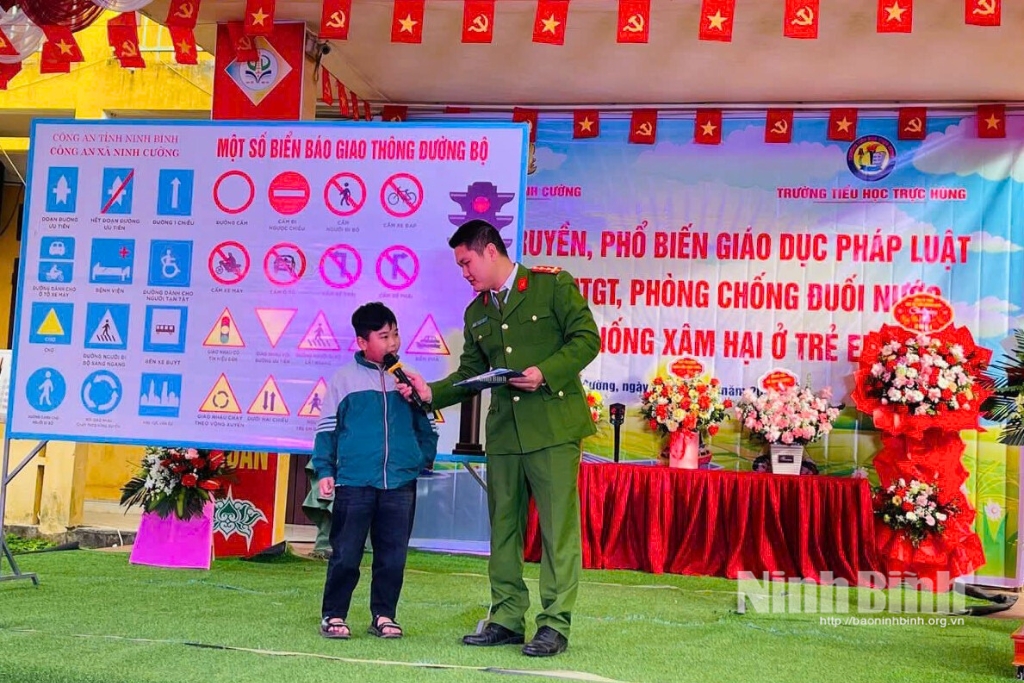 Lực lượng Công an phối hợp với Trường Tiểu học Trực Hùng, xã Ninh Cường tổ chức tuyên truyền kiến thức pháp luật về ATGT cho học sinh.