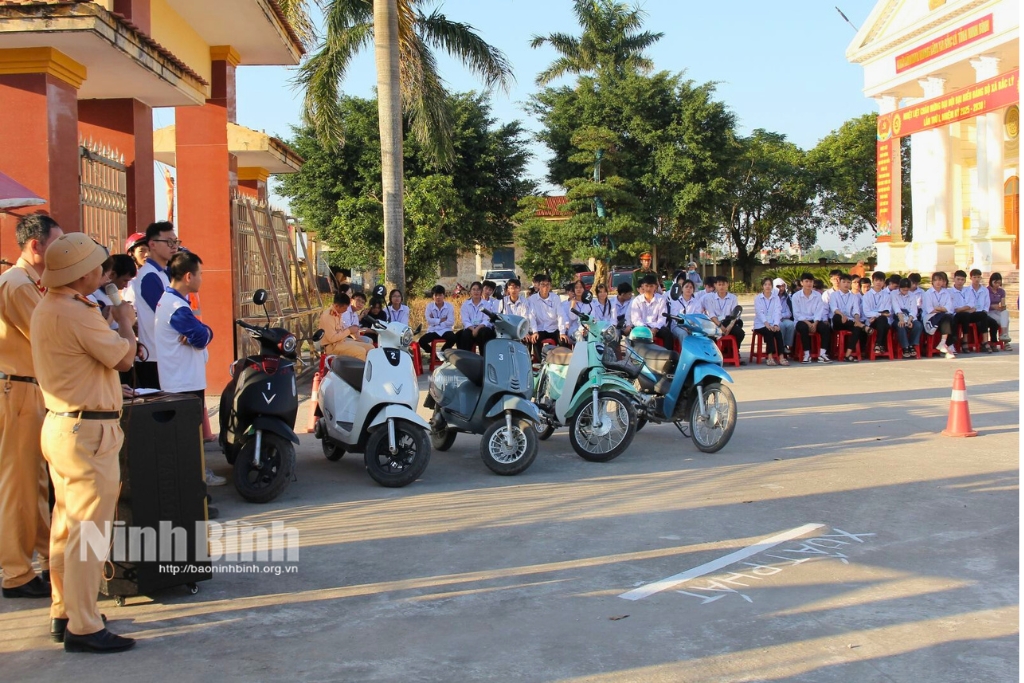 Lực lượng Công an Ninh Bình phối hợp với các cơ sở giáo dục tổ chức tuyên truyền kiến thức pháp luật về ATGT và hướng dẫn kỹ năng điều khiển xe gắn máy, xe máy điện tham gia giao thông an toàn cho lứa tuổi học sinh.