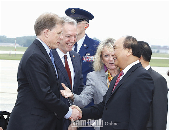 | Các quan chức Hoa Kỳ đón Thủ tướng Nguyễn Xuân Phúc tại sân bay quân sự S. An-driu, Thủ đô Oa-sinh-tơn D.C. Ảnh: Thống Nhất - TTXVN |