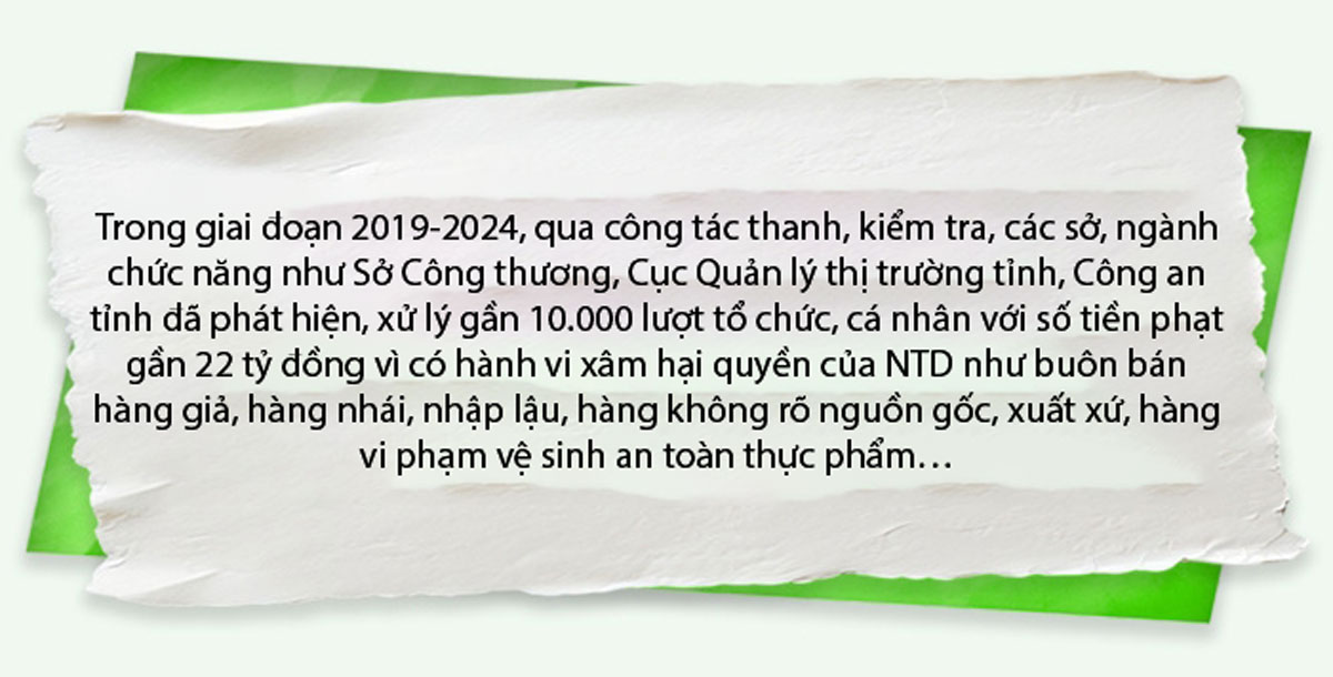 Các đối tượng thường lợi dụng những thời điểm nhu cầu mua sắm, tiêu dùng hàng hóa tăng cao như dịp cuối năm, Tết Nguyên đán, Tết Trung thu, địa bàn nông thôn, vùng xa trung tâm, các khu công nghiệp tập trung đông công nhân lao động để buôn bán hàng lậu, hàng không rõ nguồn gốc, hàng không bảo đảm chất lượng. Điều này được thể hiện rõ ở kết quả kiểm tra, xử lý vi phạm của các ngành chức năng. Cụ thể, trong giai đoạn 2019-2024, qua công tác thanh, kiểm tra, các sở, ngành chức năng như Sở Công thương, Cục Quản lý thị trường tỉnh, Công an tỉnh đã phát hiện, xử lý gần 10.000 lượt tổ chức, cá nhân với số tiền phạt gần 22 tỷ đồng vì có hành vi xâm hại quyền của NTD như: buôn bán hàng giả, hàng nhái, nhập lậu, hàng không rõ nguồn gốc, xuất xứ, vi phạm vệ sinh an toàn thực phẩm…