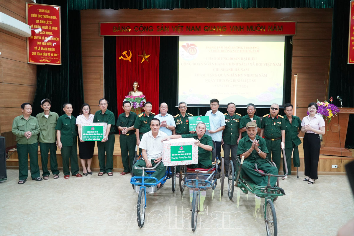 Hướng đến kỷ niệm 76 năm Ngày Thương binh - Liệt sĩ, vừa qua, Chi nhánh Ngân hàng Chính sách xã hội (CSXH) tỉnh Hà Nam đã đến thăm, tặng quà Trung tâm nuôi dưỡng thương, bệnh binh nặng và điều dưỡng người có công tỉnh Hà Nam (xã Liêm Cần, huyện Thanh Liêm). Tại đây, lãnh đạo Chi nhánh Ngân hàng CSXH tỉnh đã bày tỏ sự biết ơn sâu sắc đối với các thương, bệnh binh đã hy sinh một phần xương máu vì sự nghiệp giải phóng dân tộc, mong muốn các thương, bệnh binh tiếp tục phát huy ý chí, bản lĩnh kiên cường, vượt lên khó khăn sống vui, sống khoẻ, luôn là tấm gương sáng cho thế hệ trẻ noi theo. Nhân dịp này, đoàn đã trao tặng 25 triệu đồng tới Trung tâm nuôi dưỡng thương, bệnh binh nặng và điều dưỡng người có công tỉnh Hà Nam. Đây là việc làm thể hiện truyền thống “Uống nước nhớ nguồn”, sự tri ân sâu sắc đối với các thương bệnh binh – những người đã cống hiến một phần xương máu của mình vì độc lập, tự do cho Tổ quốc.