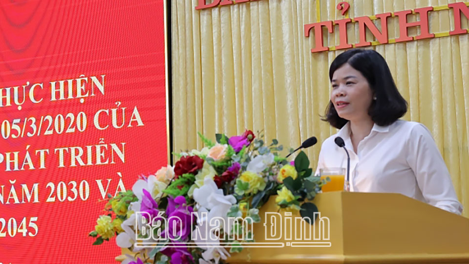 | Đồng chí Phạm Thị Thu Hằng, Uỷ viên Ban TVTU, Trưởng Ban Tuyên giáo Tỉnh uỷ phát biểu tại hội nghị. |
