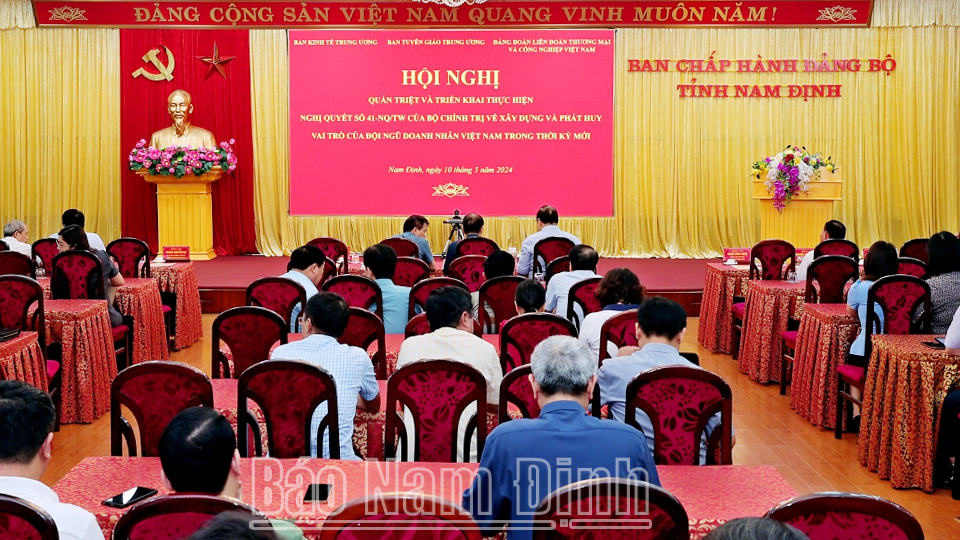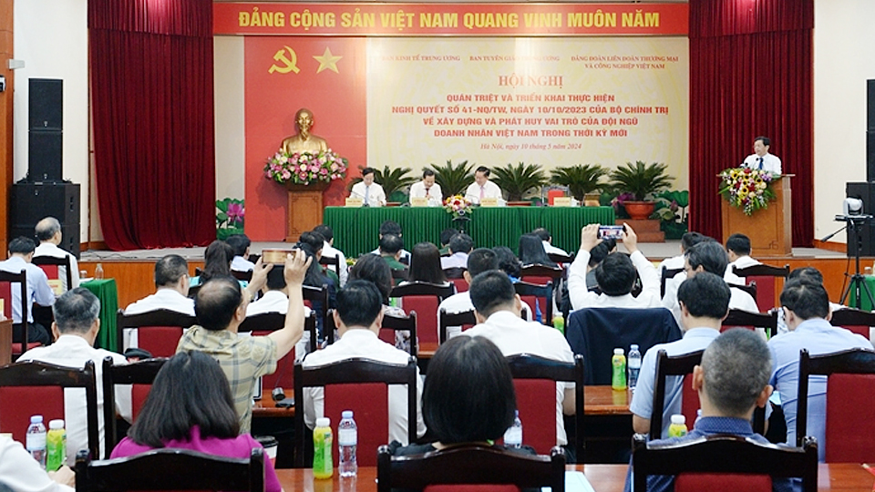 Sáng 10-5, Ban Tuyên giáo Trung ương chủ trì, phối hợp với Ban Kinh tế Trung ương, Đảng đoàn Liên đoàn Thương mại và Công nghiệp Việt Nam (VCCI) tổ chức hội nghị quán triệt và triển khai thực hiện Nghị quyết số 41-NQ/TW, ngày 10-10-2023 của Bộ Chính trị về xây dựng và phát huy vai trò của đội ngũ doanh nhân Việt Nam trong thời kỳ mới. Hội nghị được tổ chức trực tiếp tại Hà Nội, kết hợp hình thức trực tuyến đến điểm cầu các Ban, Bộ, ngành Trung ương, các tỉnh, thành phố trên toàn quốc.