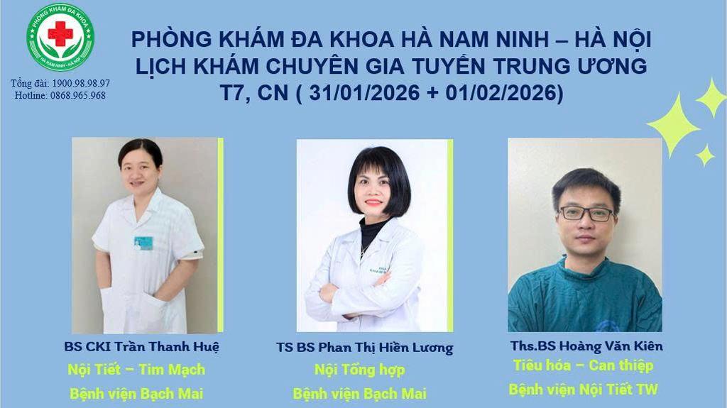 Phòng khám ĐK Hà Nam Ninh - Hà Nội trân trọng thông báo Lịch khám chuyên khoa sâu với bác sĩ tuyến trung ương tuần này Thứ 7 + Chủ nhật (31/01/2026 + 01/02/2026).