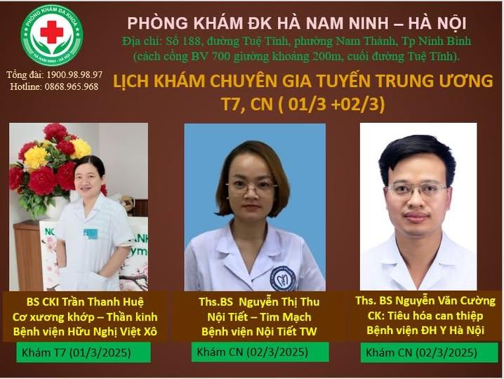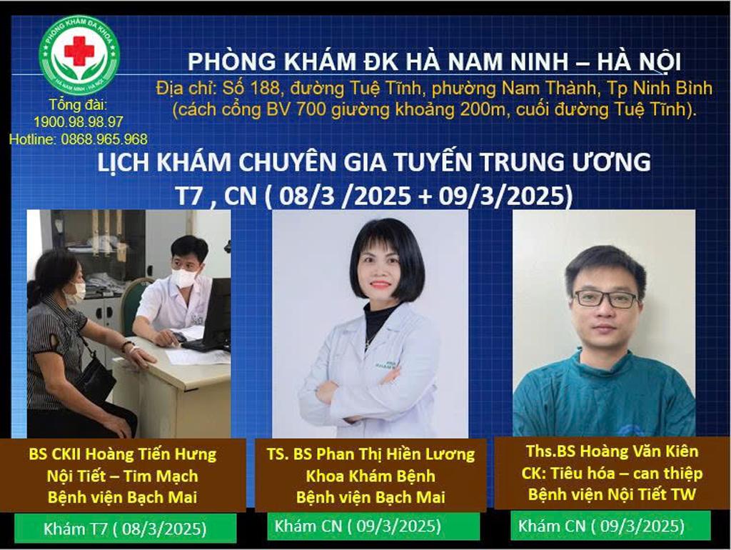 Đến với Phòng khám đa khoa Hà Nam Ninh - Hà Nội tuần này Thứ Bảy + Chủ nhật (26/04/2025 - 27/04/2025). Quý khách hàng sẽ được khám, chữa bệnh cùng các bác sĩ chuyên môn sâu, giàu kinh nghiệm tuyến Trung ương ở các Bệnh viện lớn như: Bệnh viện Bạch Mai, Bệnh viện Nội Tiết Trung ương, Bệnh viện Hữu Nghị Việt Xô.