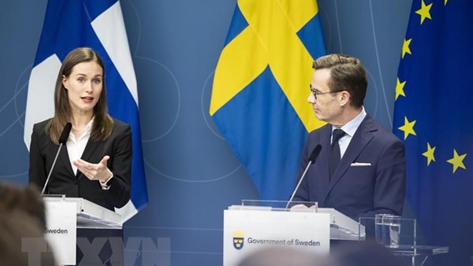 | Thủ tướng Phần Lan Sanna Marin (trái) và người đồng cấp Thụy Điển Ulf Kristersson khẳng định cam kết gia nhập Tổ chức Hiệp ước Bắc Đại Tây Dương (NATO). (Ảnh: THX/TTXVN) |