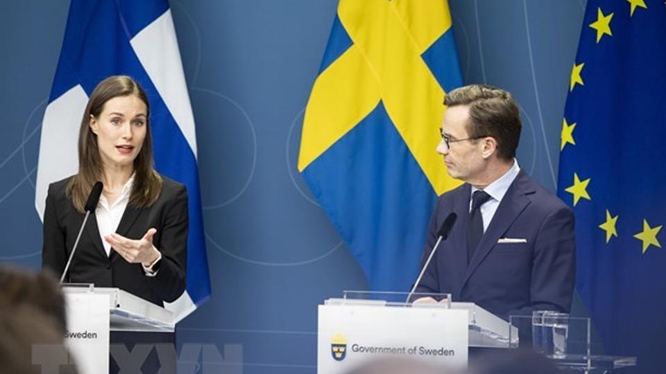 | Thủ tướng Phần Lan Sanna Marin (trái) và người đồng cấp Thụy Điển Ulf Kristersson khẳng định cam kết gia nhập Tổ chức Hiệp ước Bắc Đại Tây Dương (NATO). (Ảnh: THX/TTXVN) |
