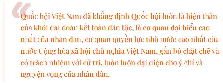 Quốc hội Việt Nam đã khẳng định Quốc hội luôn là hiện thân của khối đại đoàn kết toàn dân tộc, là cơ quan đại biểu cao nhất của nhân dân, cơ quan quyền lực nhà nước cao nhất của nước Cộng hòa xã hội chủ nghĩa Việt Nam, gắn bó chặt chẽ và có trách nhiệm với cử tri, luôn luôn đại diện cho ý chí và nguyện vọng của nhân dân.