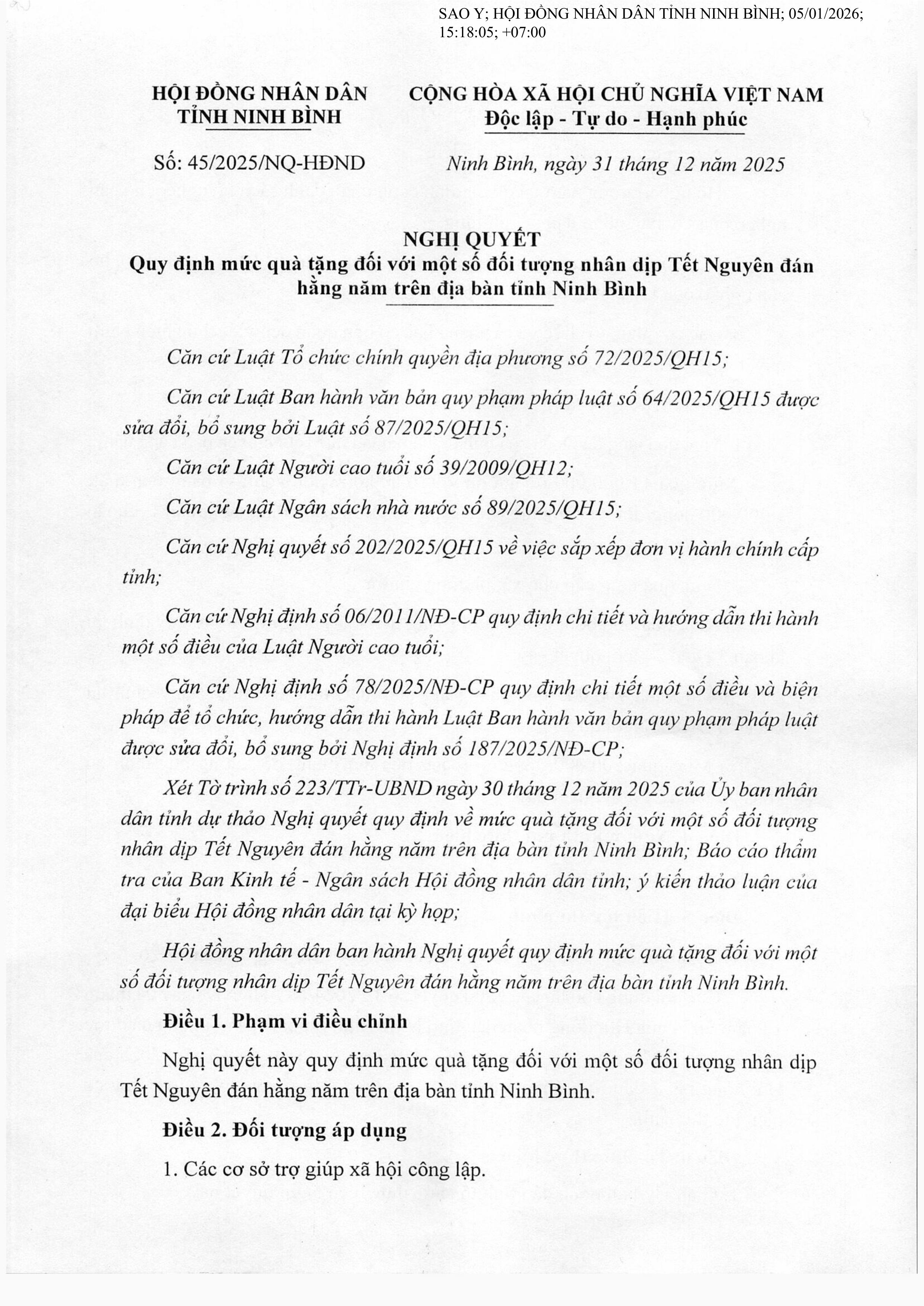Ngày 31/12/2025, tại Kỳ họp thứ 7, HĐND tỉnh khóa XV đã biểu quyết thông qua Nghị quyết số 45/2025/NQ-HĐND “Quy định mức quà tặng đối với một số đối tượng nhân dịp Tết Nguyên đán hằng năm trên địa bàn tỉnh Ninh Bình”.