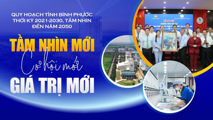Đến năm 2050, Bình Phước trở thành tỉnh công nghiệp hiện đại, phát triển giàu mạnh và văn minh, trở thành một trong những cực tăng trưởng kinh tế quan trọng của vùng Đông Nam Bộ, tương đương các tỉnh có trình độ phát triển khá của cả nước; không gian phát triển hài hòa giữa đô thị và nông thôn; xây dựng đô thị theo hướng sinh thái, hiện đại và bền vững. Bảo tồn và phát huy các giá trị văn hóa, dân tộc, con người phát triển toàn diện, môi trường sống trong lành, là “điểm đến hấp dẫn” của vùng Đông Nam Bộ.