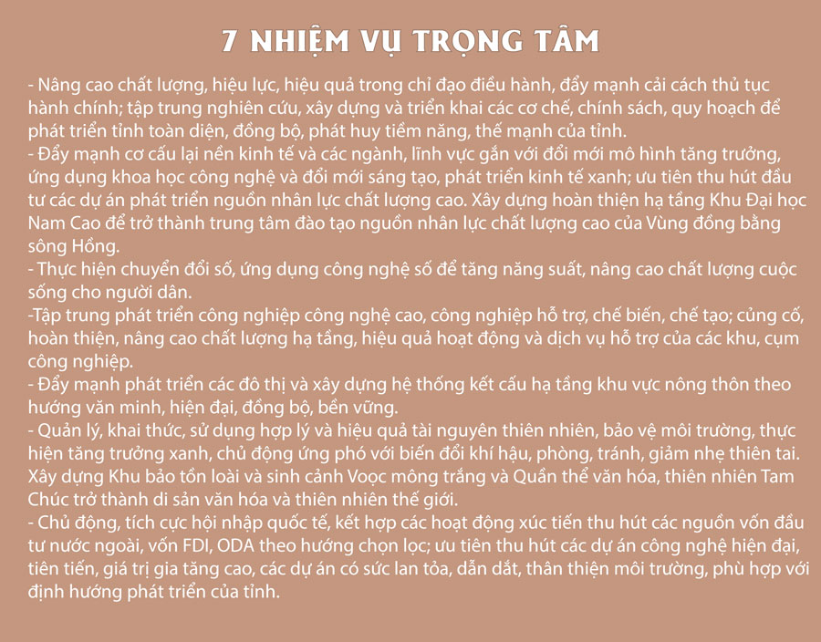 Về mục tiêu phát triển: Phấn đấu đến năm 2030 đạt mức phát triển khá của Vùng đồng bằng sông Hồng. Tốc độ tăng trưởng kinh tế (GRDP) bình quân giai đoạn 2021-2030 đạt khoảng 11,2%/năm Cơ cấu kinh tế ngành công nghiệp-xây dựng chiếm khoảng 70,5%, ngành dịch vụ chiếm 26%, ngành nông, lâm nghiệp và thủy sản chiếm 3,5%. GRDP bình quân đầu người đạt trên 230 triệu đồng; thu ngân sách nhà nước trên địa bàn đạt trên 21 nghìn tỷ đồng; tỷ lệ đô thị hóa đạt trên 60%; 70% số xã đạt chuẩn nông thôn mới nâng cao, nông thôn mới kiểu mẫu và phấn đấu có 03 huyện đạt chuẩn nông thôn mới nâng cao.